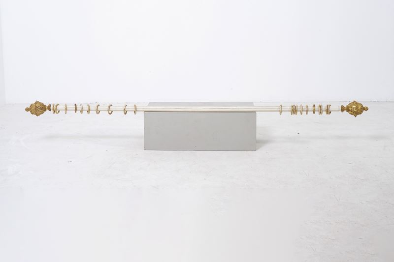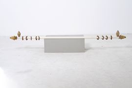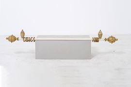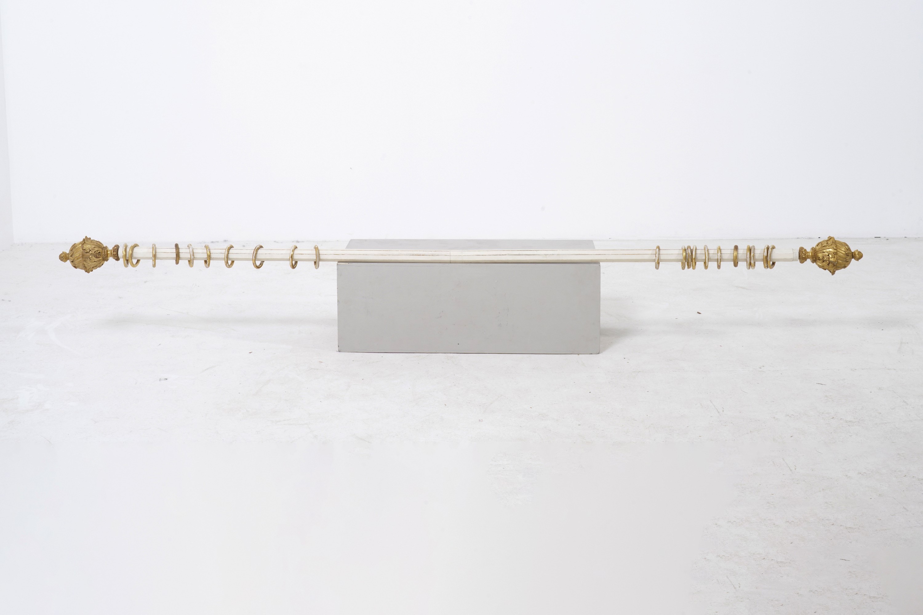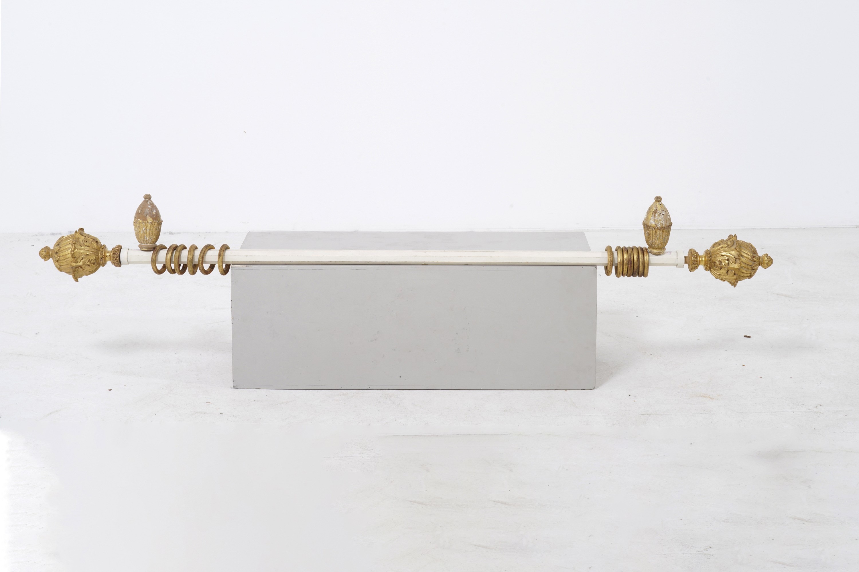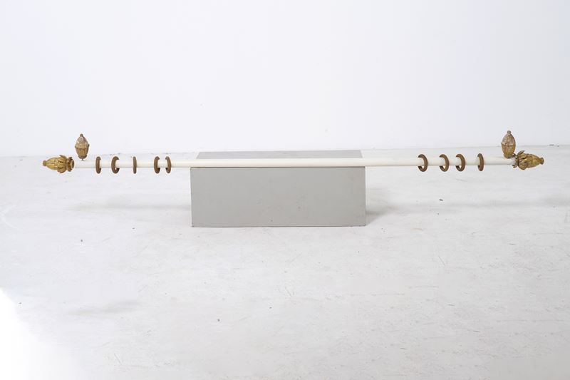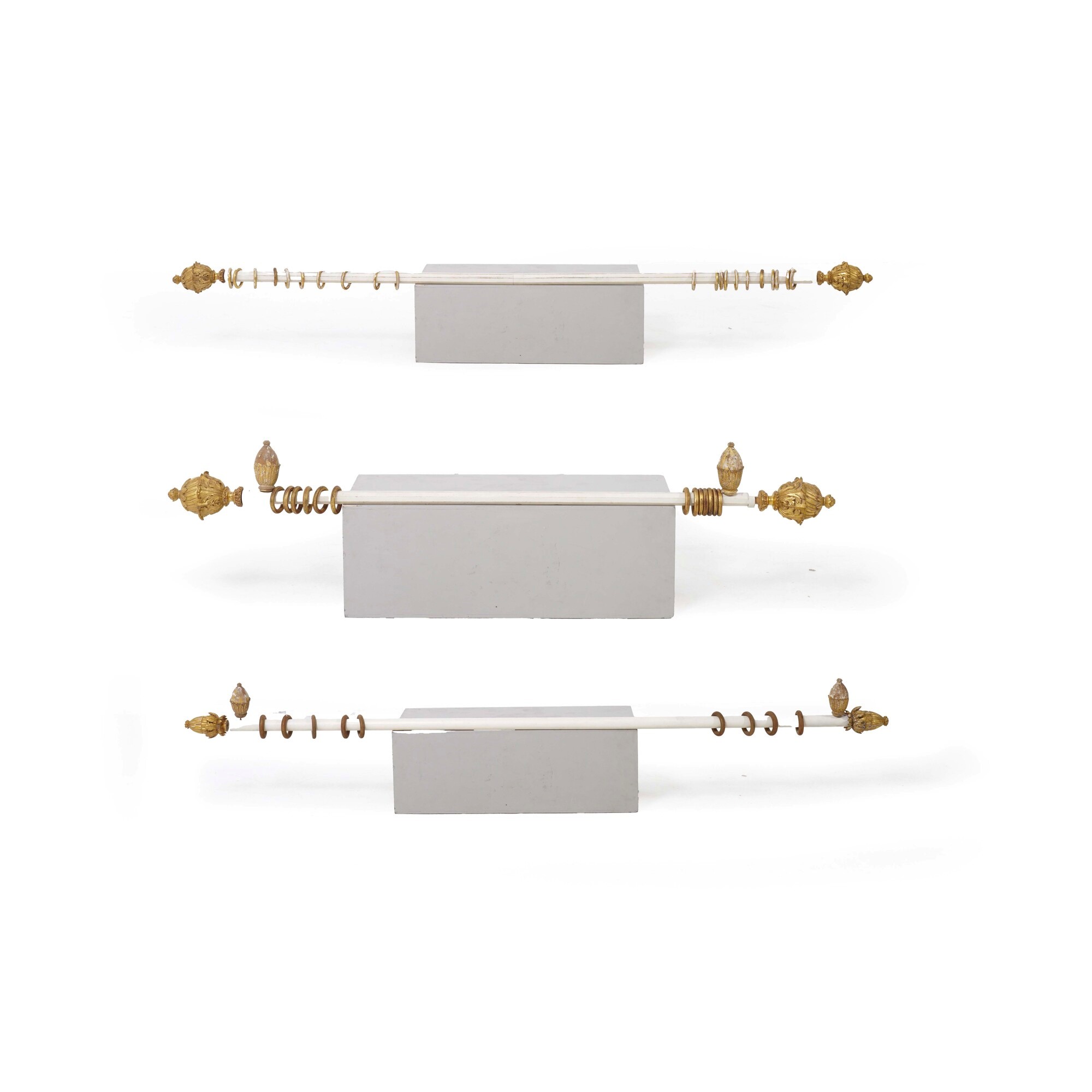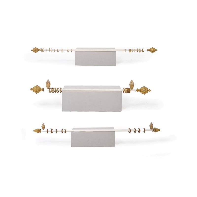 Tre bastoni per tende con pigne in legno intagliato e dorato