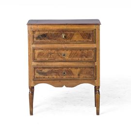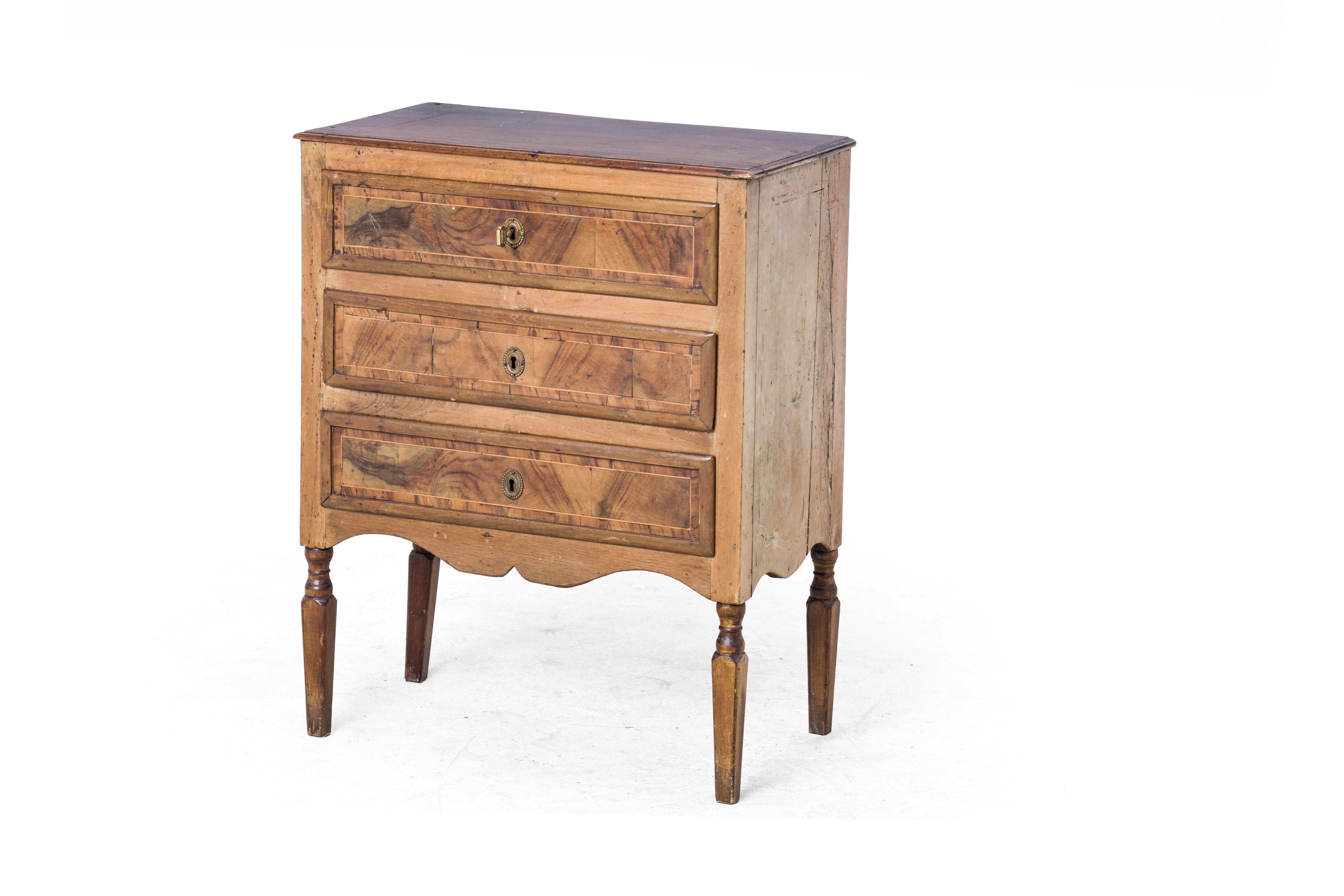 Comodino in noce e radica di noce a tre cassetti con filettature in legno chiaro Italia centrale, XVIII secolo