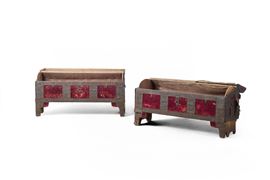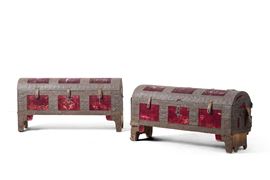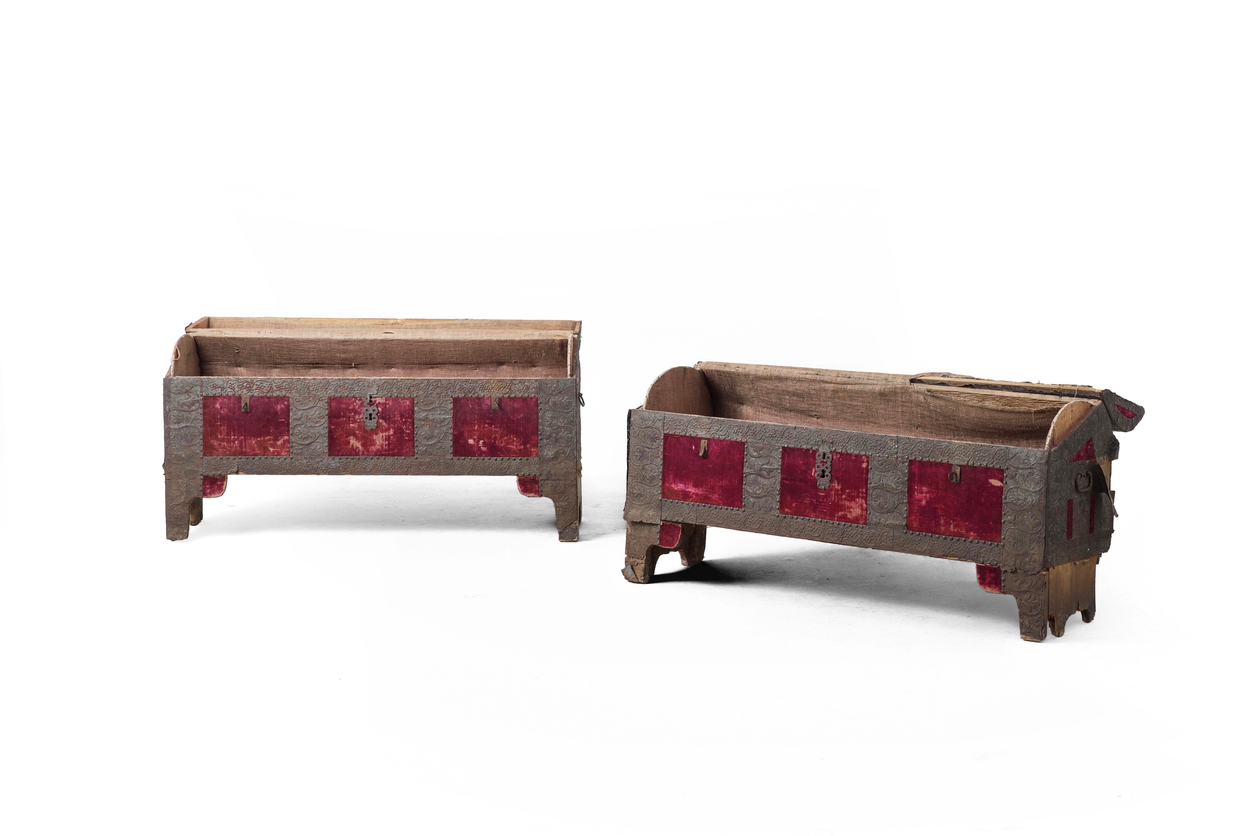 Coppia di cassoni in legno con coperchio bombato rivestiti in velluto rosso e placche in lamina di metallo riccamente sbalzato, XIX secolo