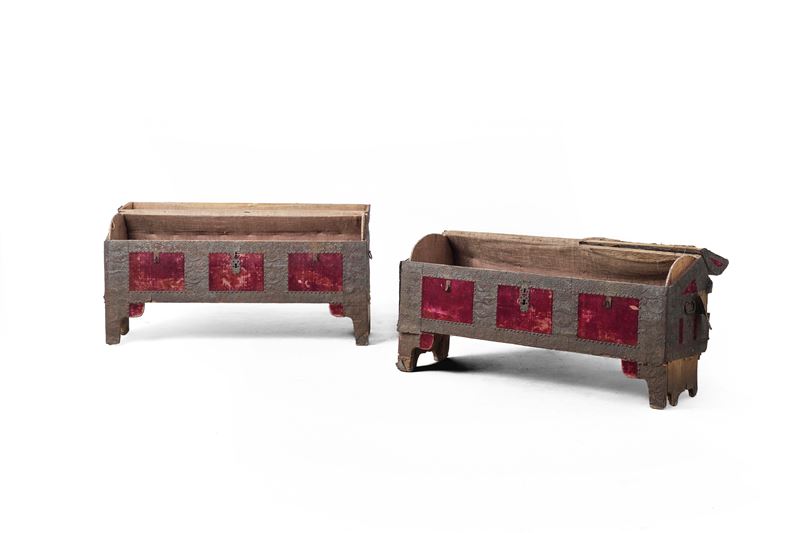 Coppia di cassoni in legno con coperchio bombato rivestiti in velluto rosso e placche in lamina di metallo riccamente sbalzato, [..]