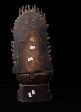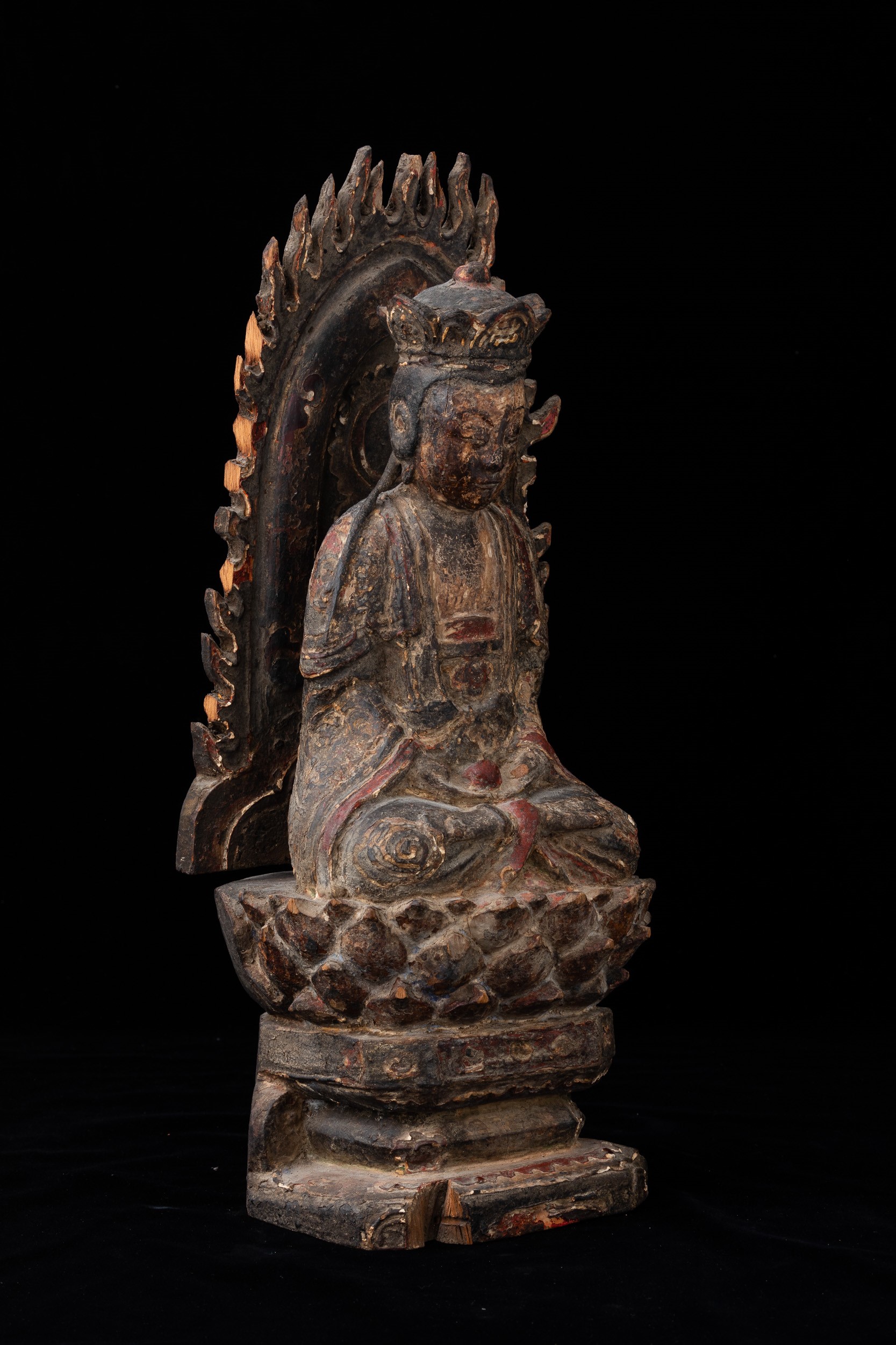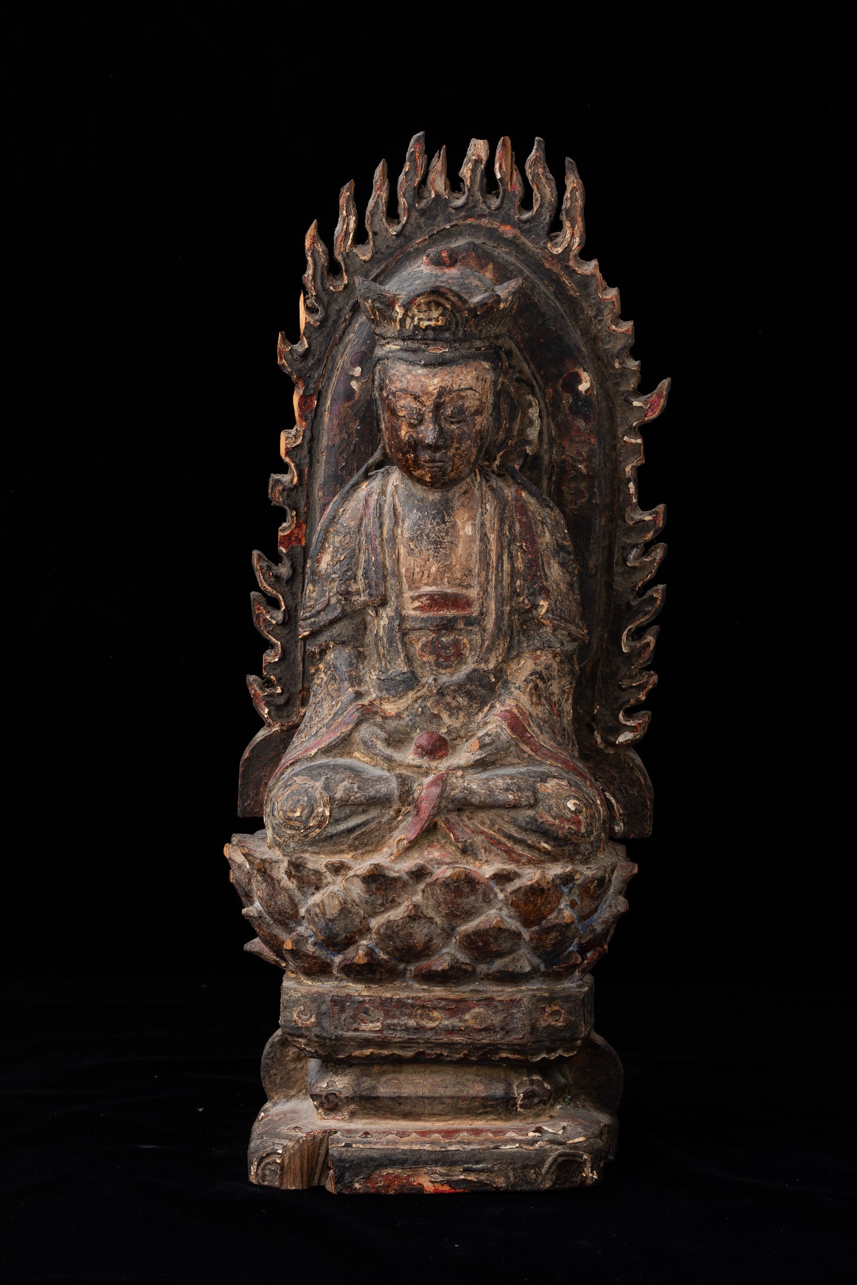 Figura di Buddha Amitayus seduto su fiore di loto entro aura scolpito in legno con tracce di policromia, Cina, probabilmente [..]
