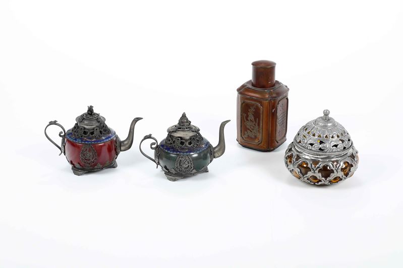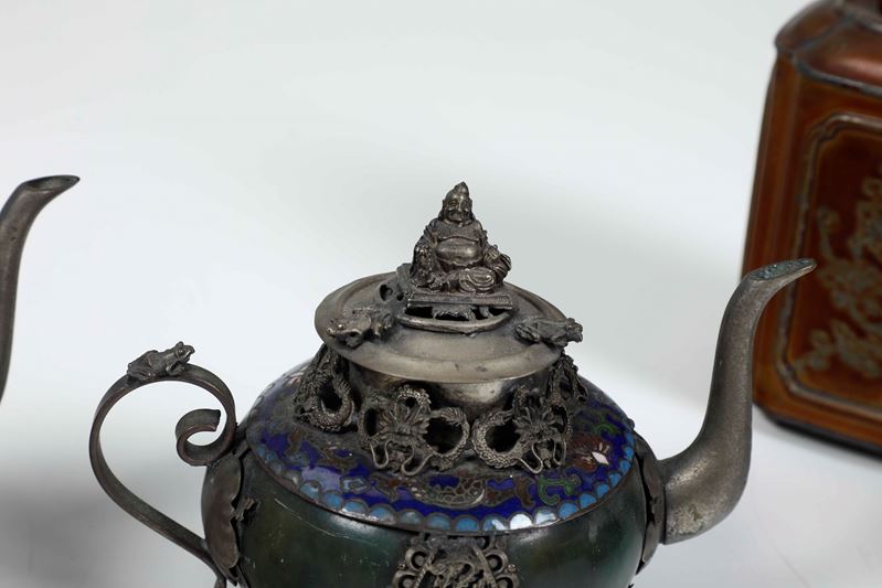 Lotto composto da due teiere cloisonné, un vaso e un porta tè. Manifattura orientale, XX secolo