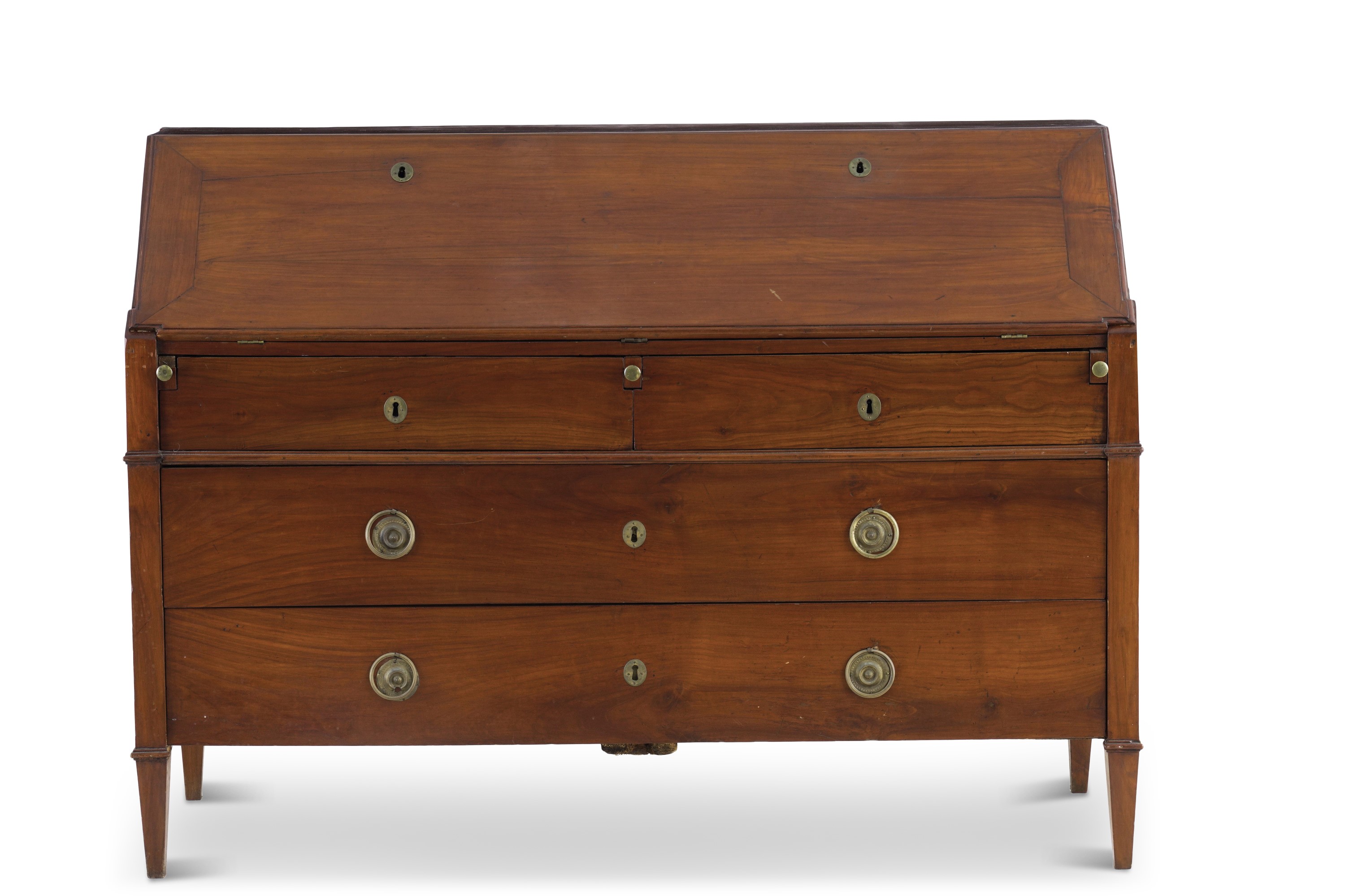 Fronte a due cassetti, due cassettini e ribalta, piedi rastremati
