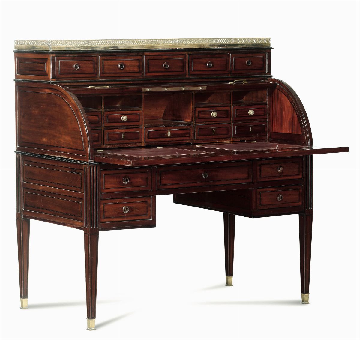 due cassetti laterali ed uno centrale, piano superiore con ringhierina traforata e cinque cassettini sottostanti, cm 133x73x135