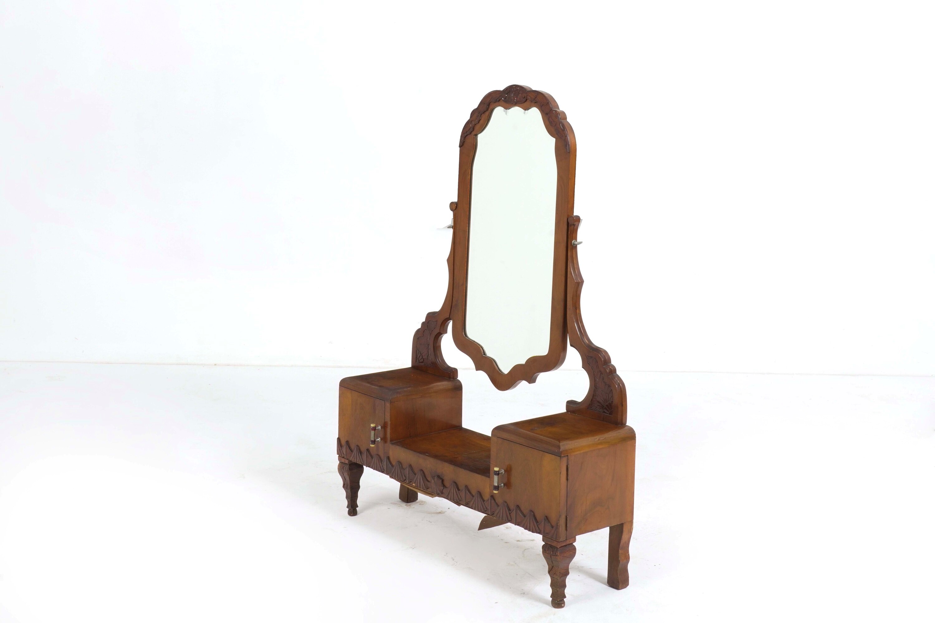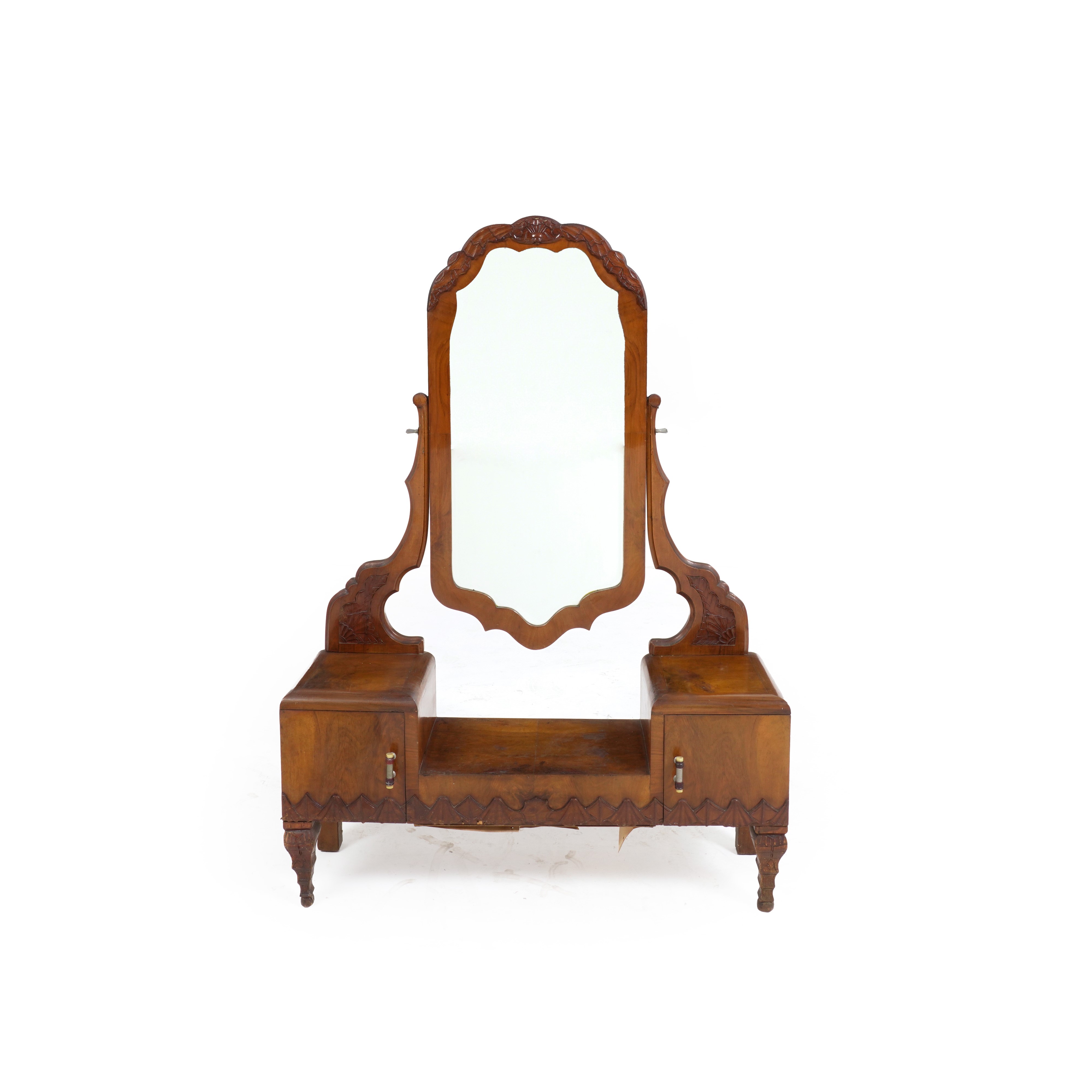 Fronte con piano centrale e due cassetti laterali, specchiera sagomata con sostegni a volute intagliati