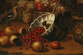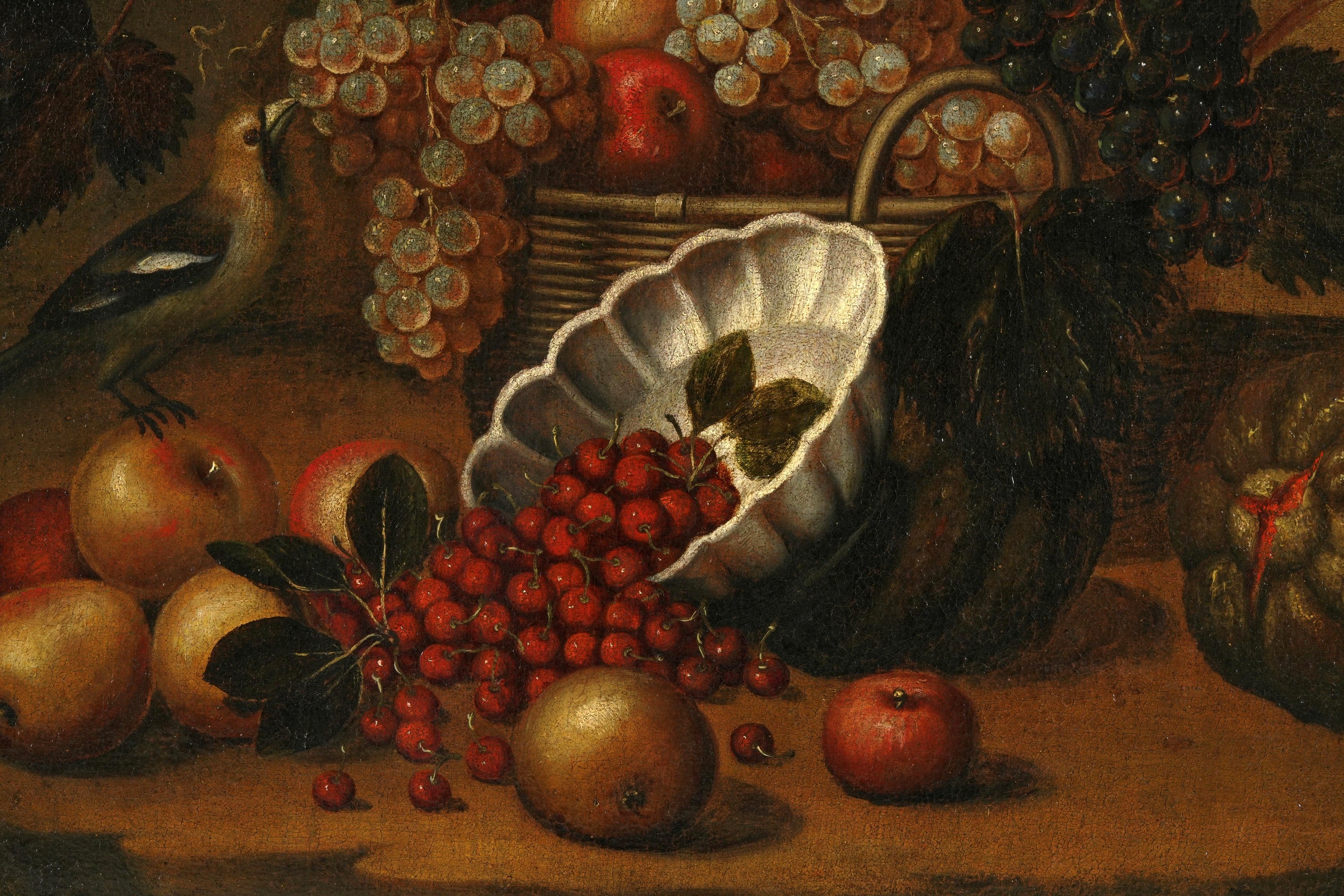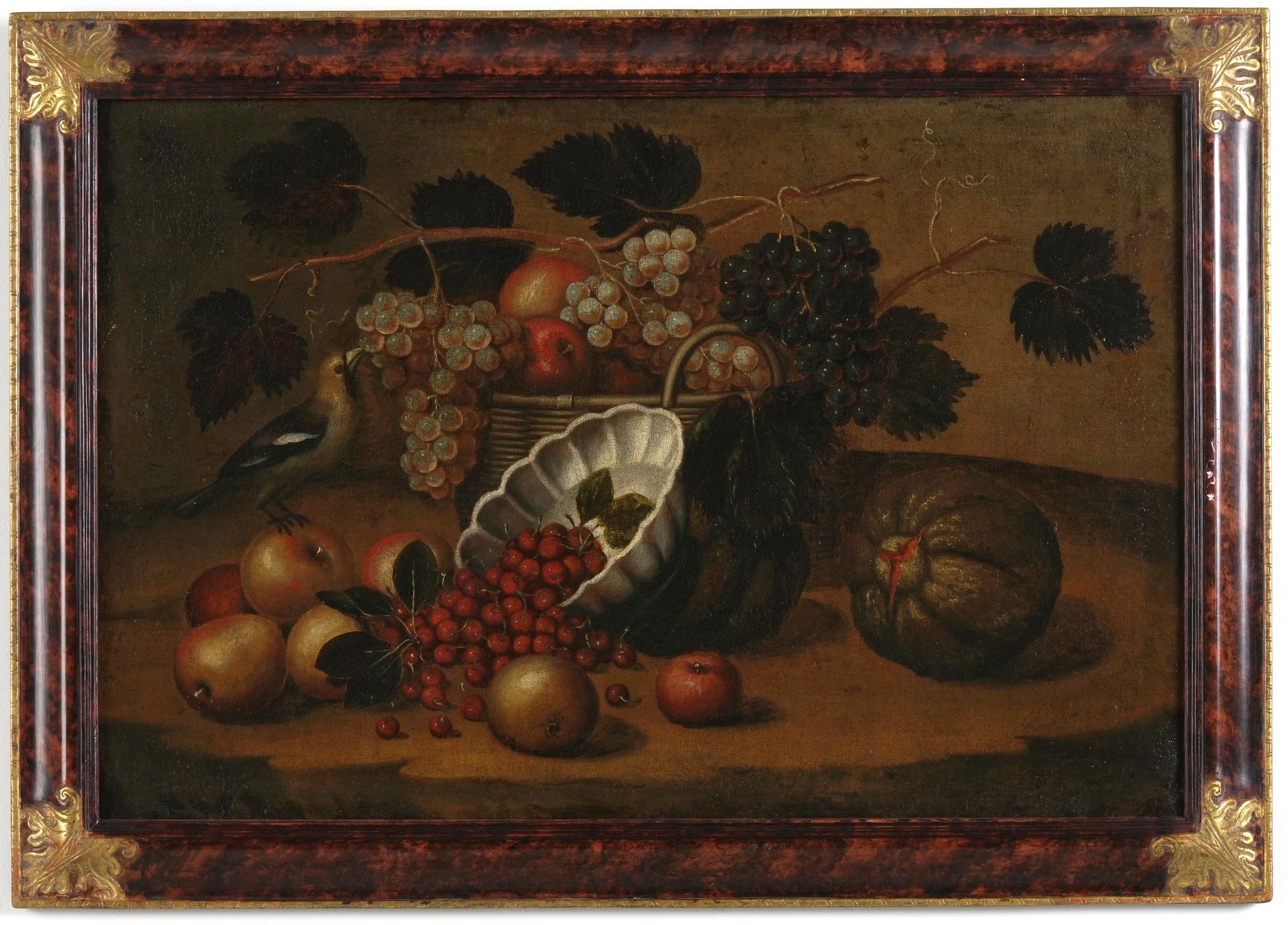 Scuola del XVII secolo Natura morta con frutta, vasellame e uccellino