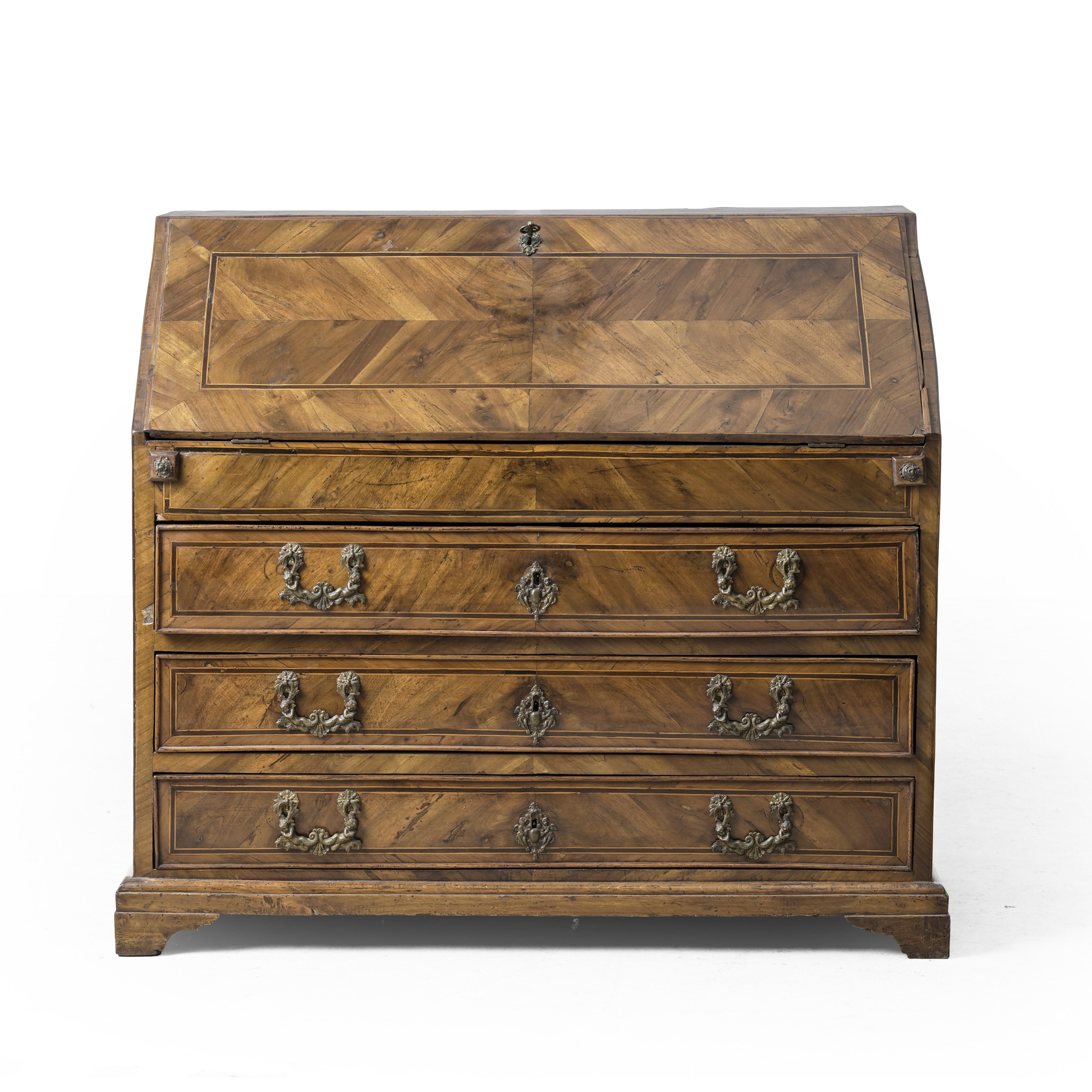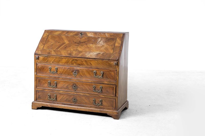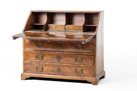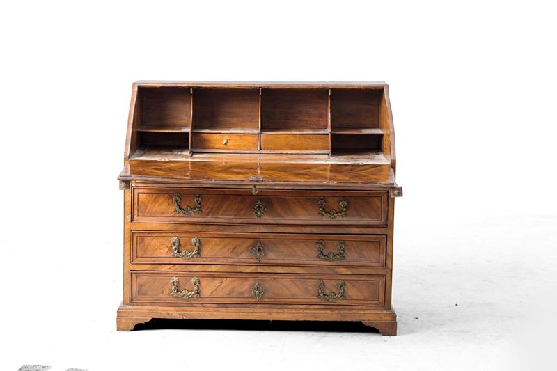 Fronte a tre cassetti e ribalta che cela scarabattolo con cassettini e comparti (difetti)