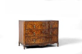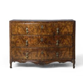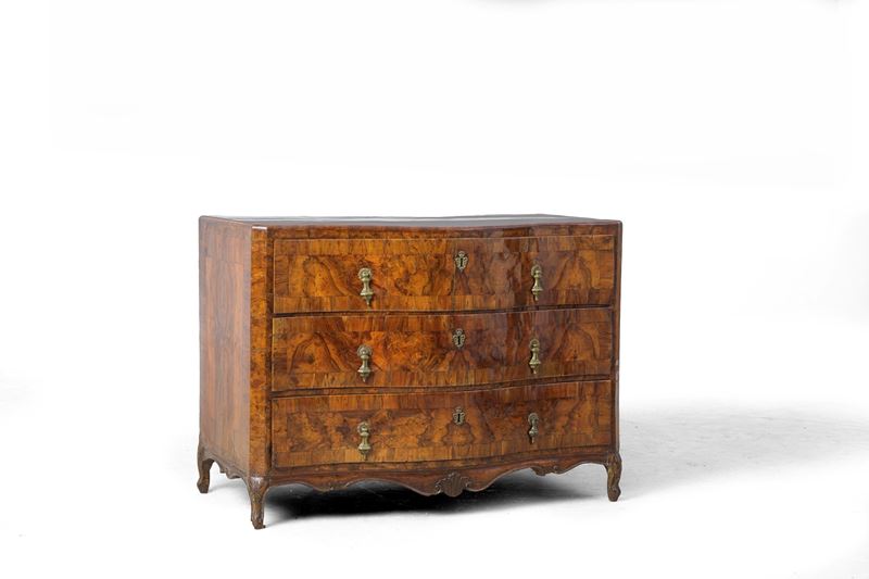 Comò in legno impiallacciato di radica di noce. XVIII secolo