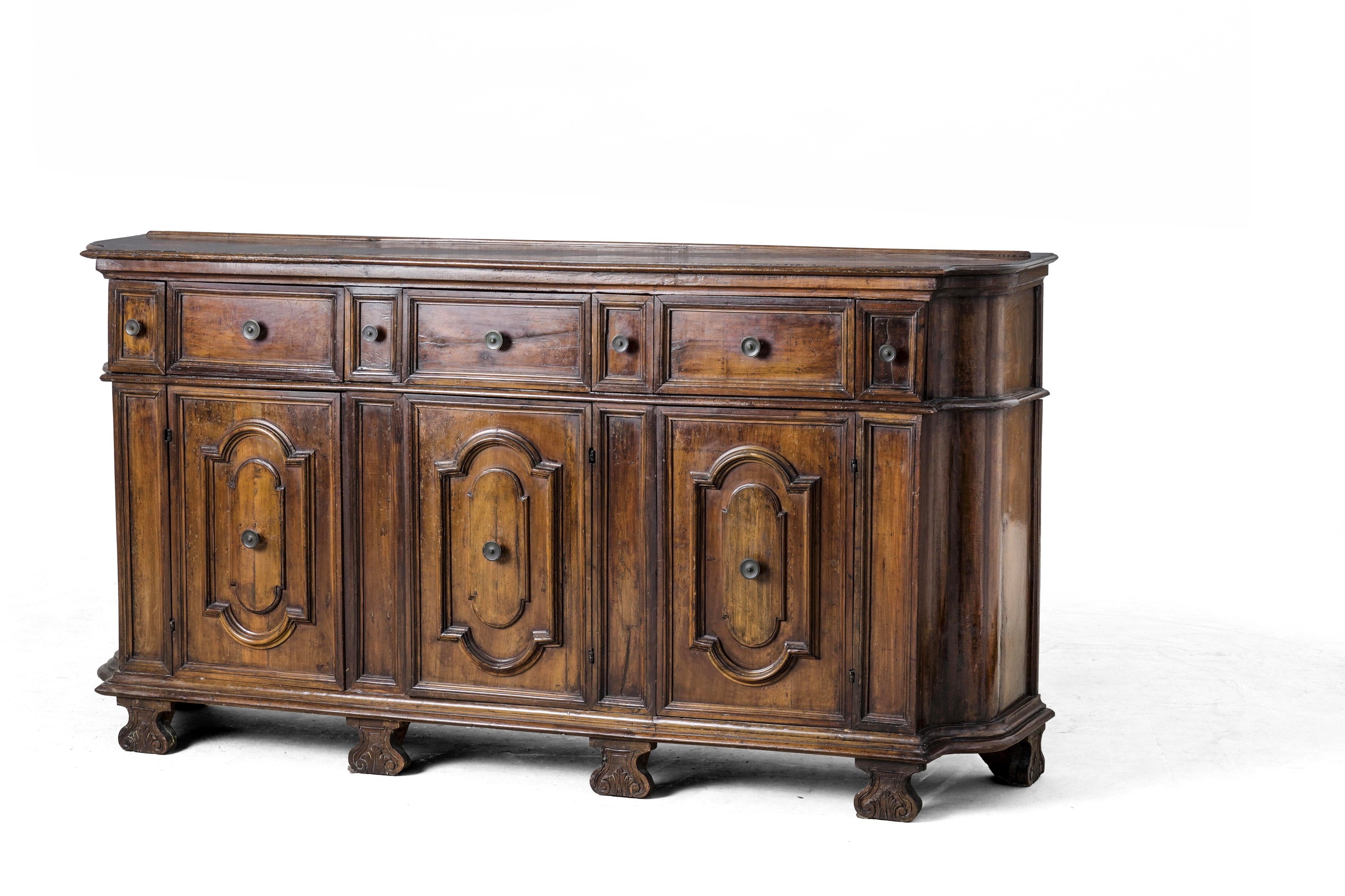 Credenza in legno tinto noce a tre ante e tre cassetti. Lombardia XVIII secolo