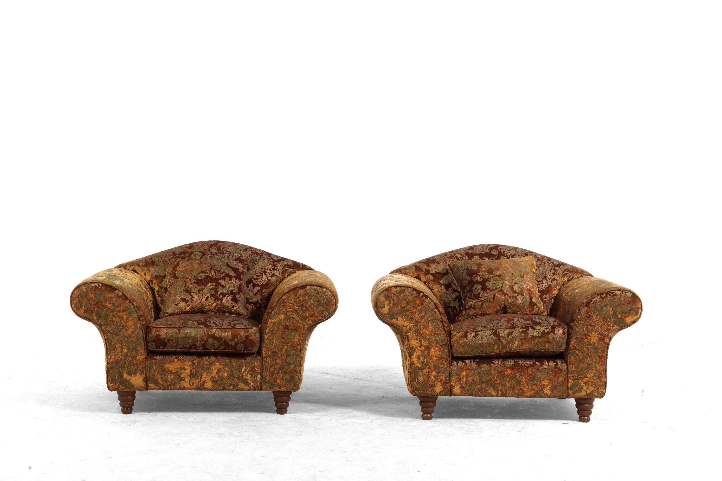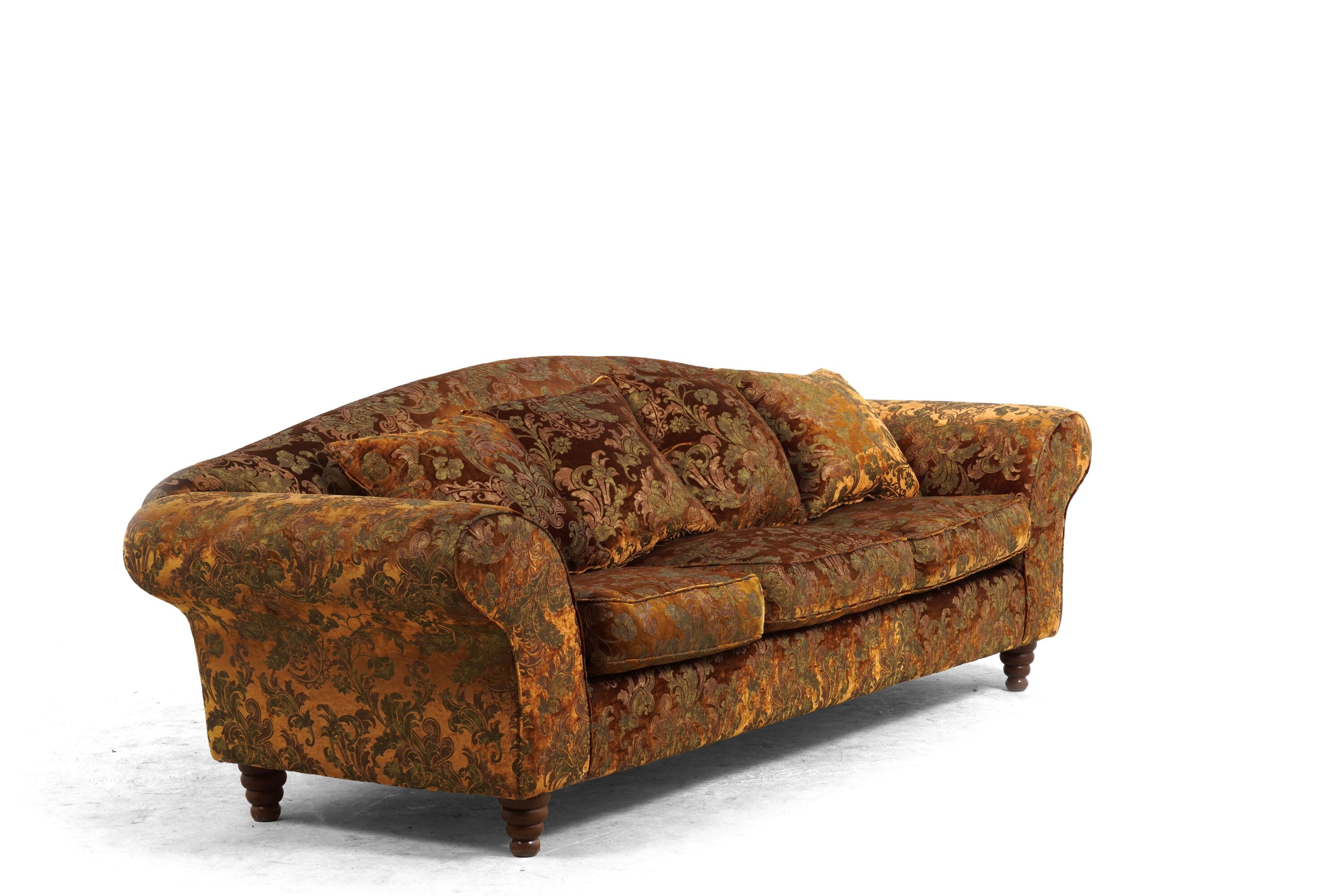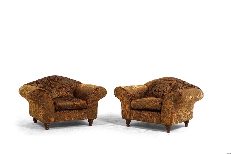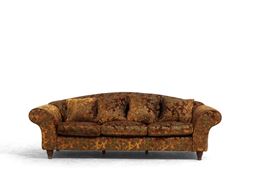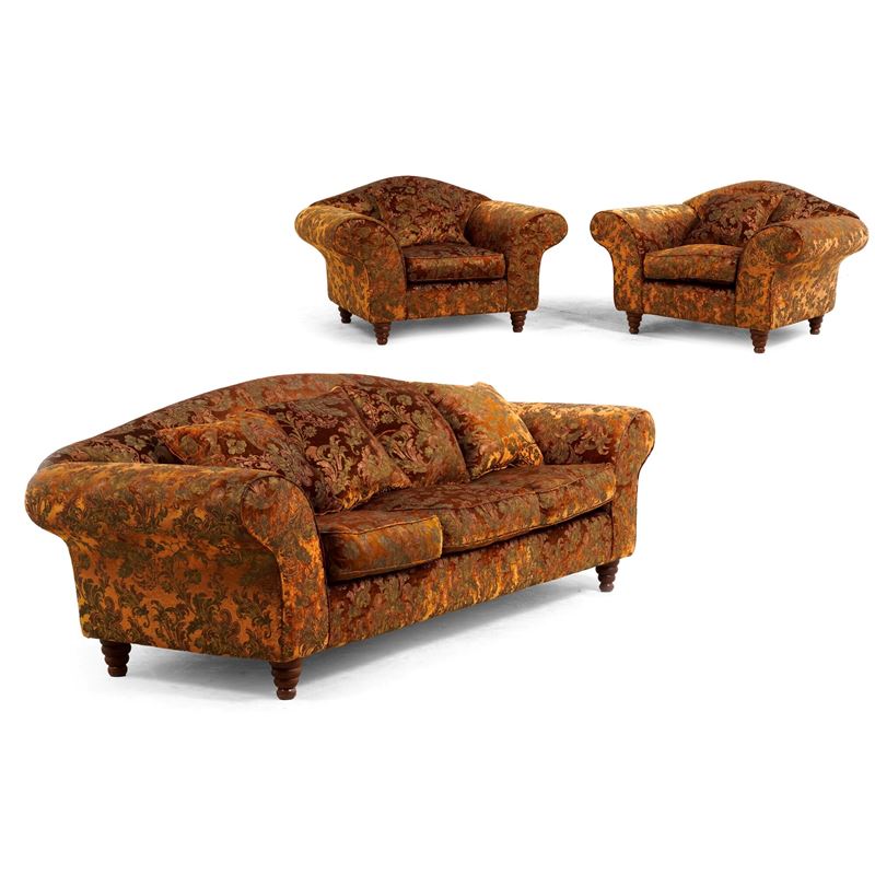 Divano e due poltrone rivestite con tessuto damascato. XX secolo