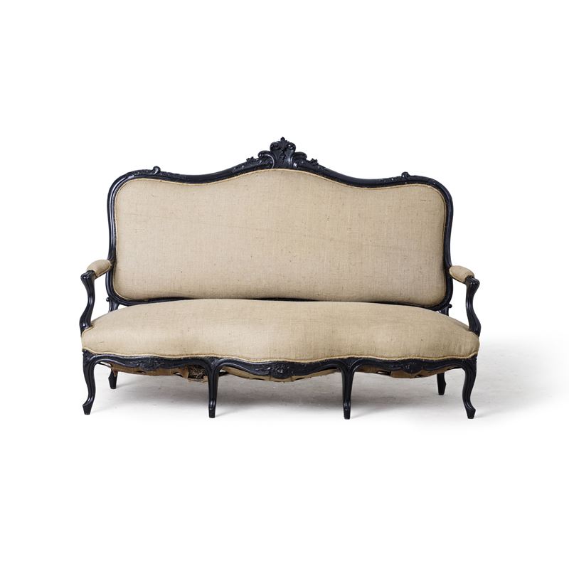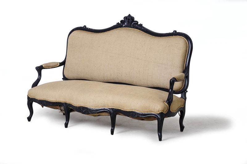 Divano in legno intagliato e laccato nero in stile Luigi Filippo