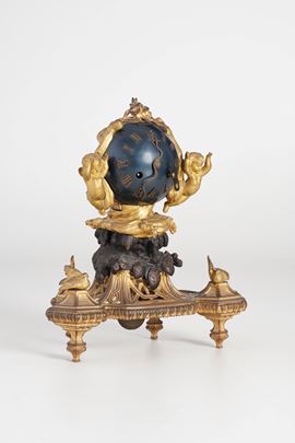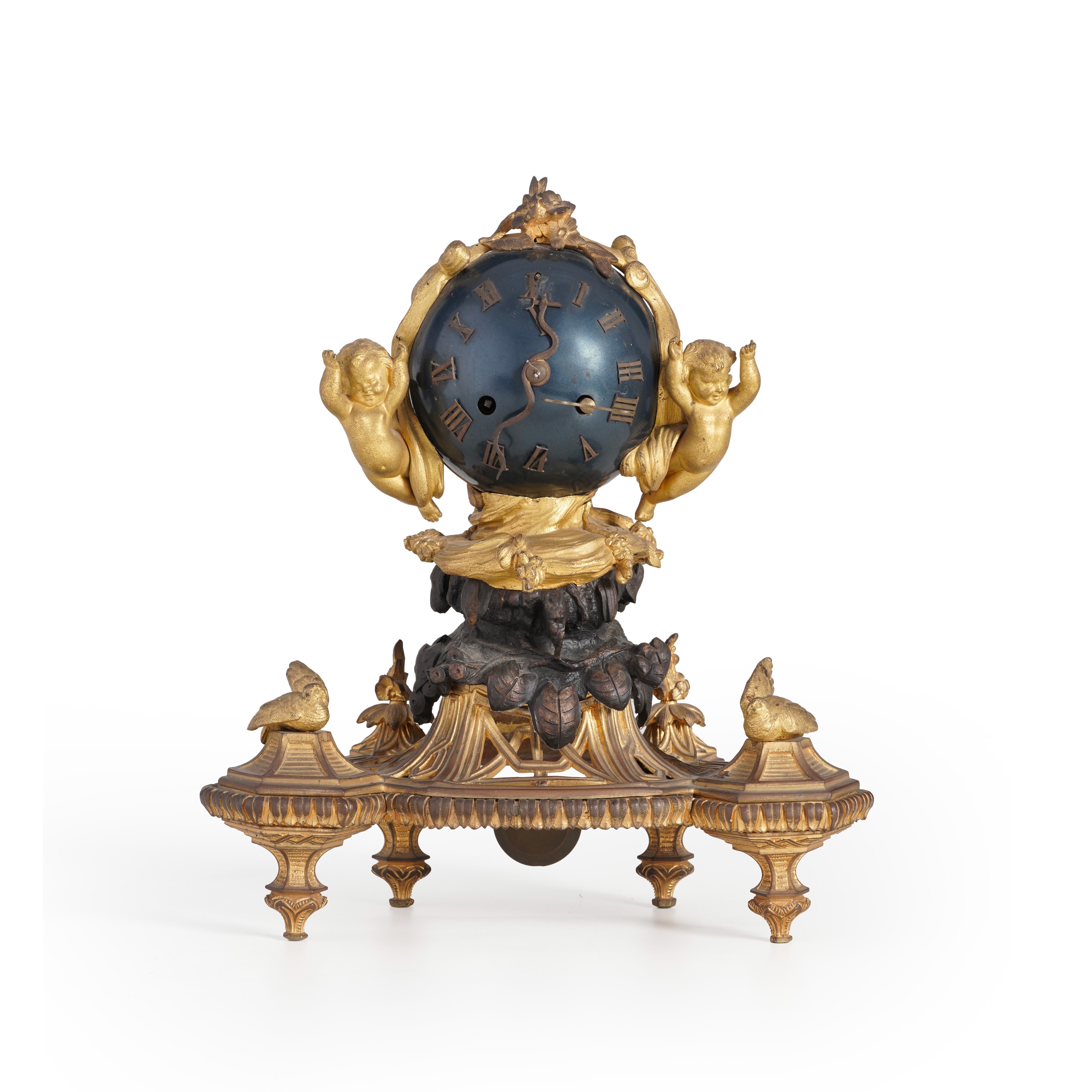 Base neoclassica con uccellini, cassa sferica con numeri romani contornata da amorini