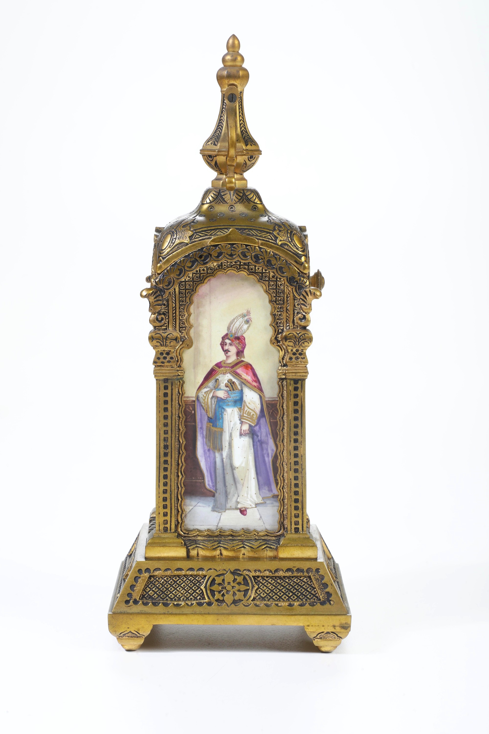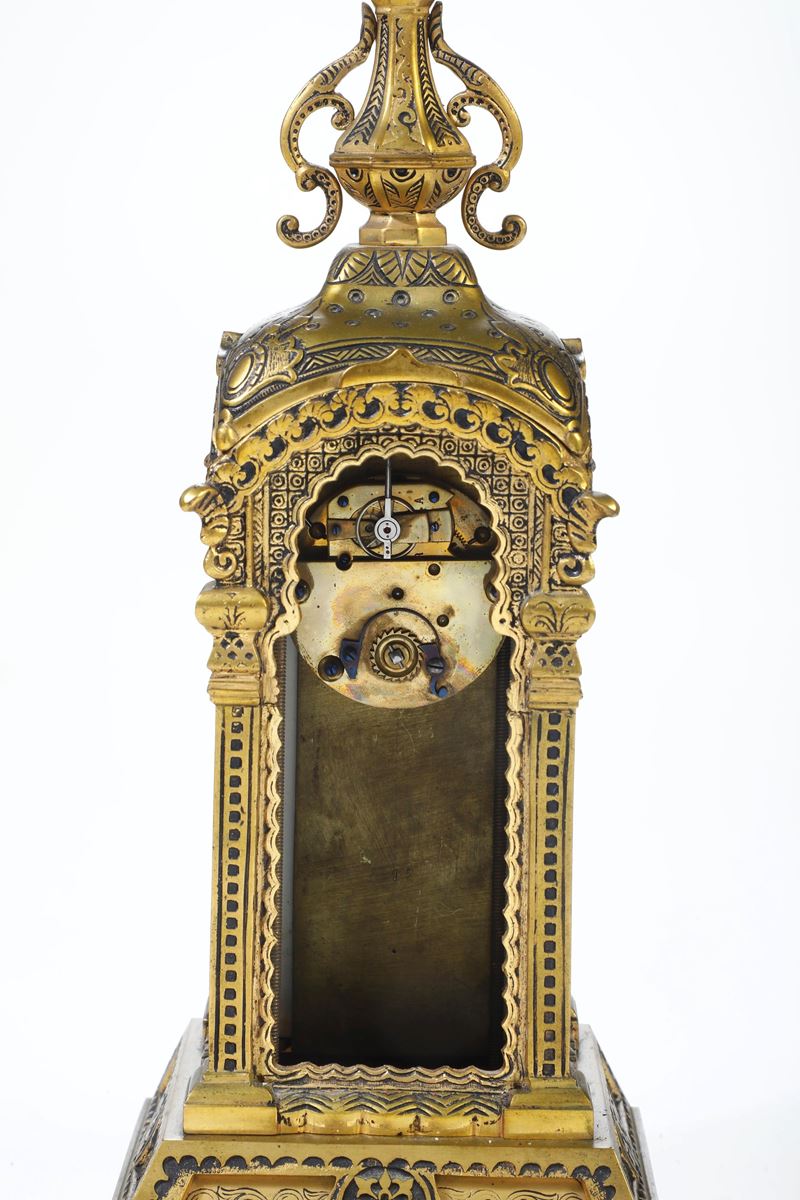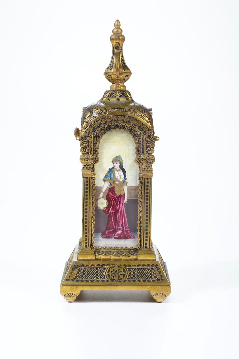 Pendola da tavolo in bronzo dorato e porcellana dipinta. XIX-XX secolo