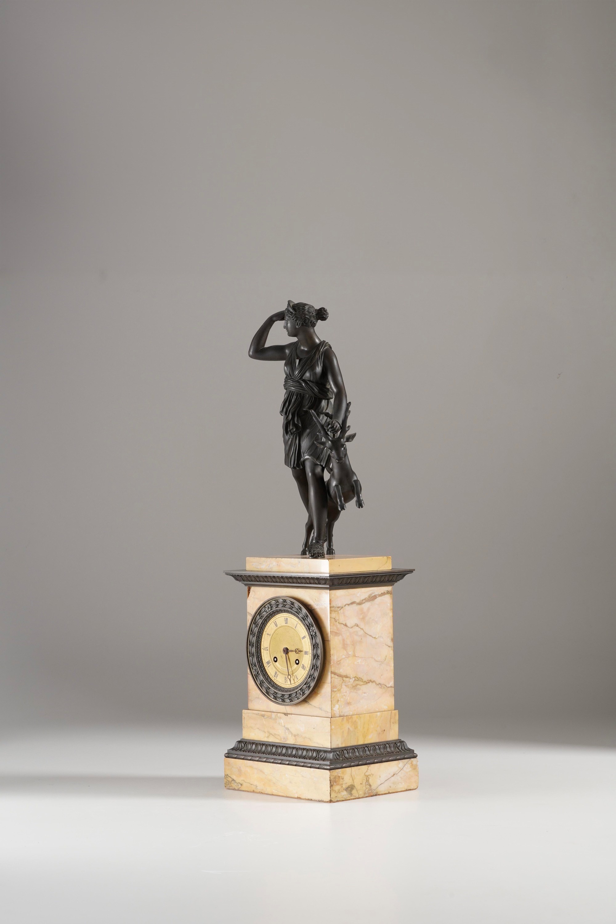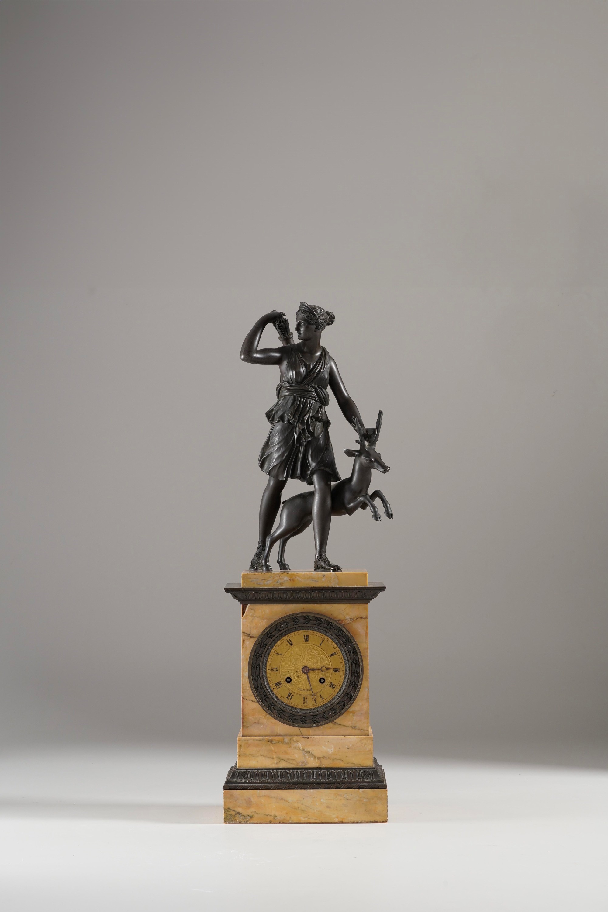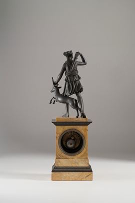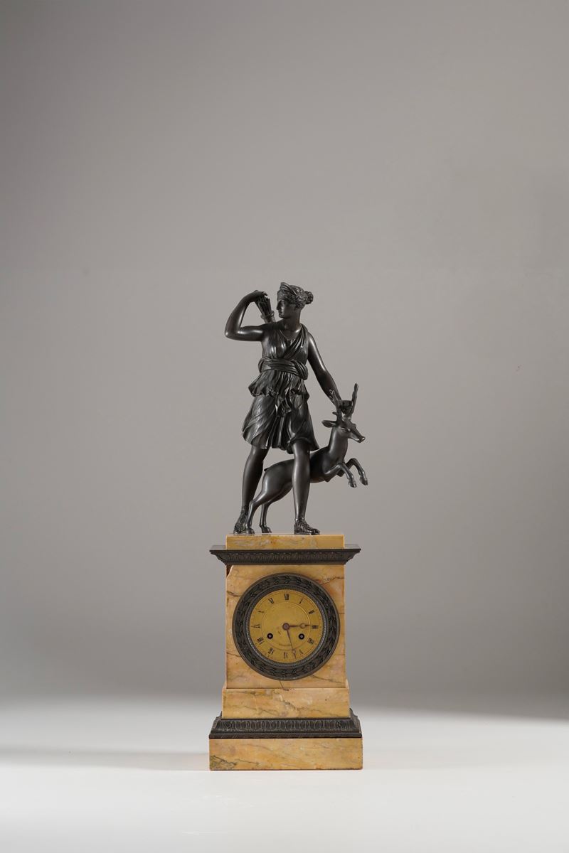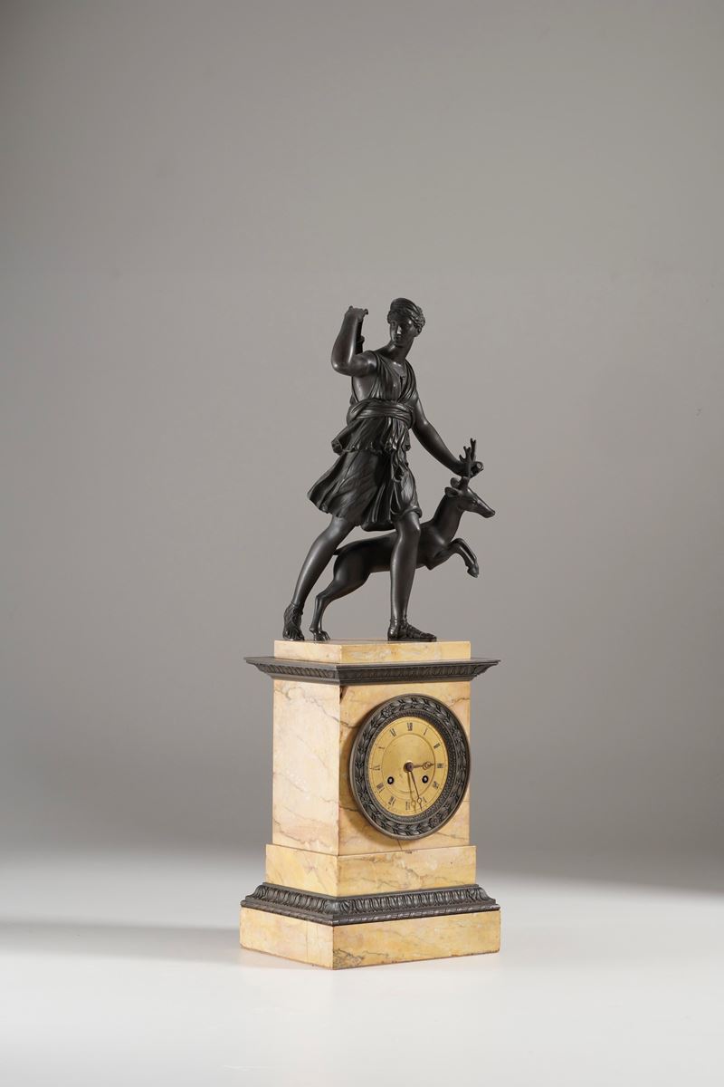 Cassa in marmo giallo con cornicette decorative in bronzo, sormontata da sculturina di Diana cacciatrice in bronzo brunito, quadrante dorato con numeri romani