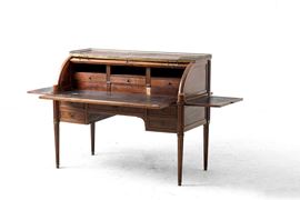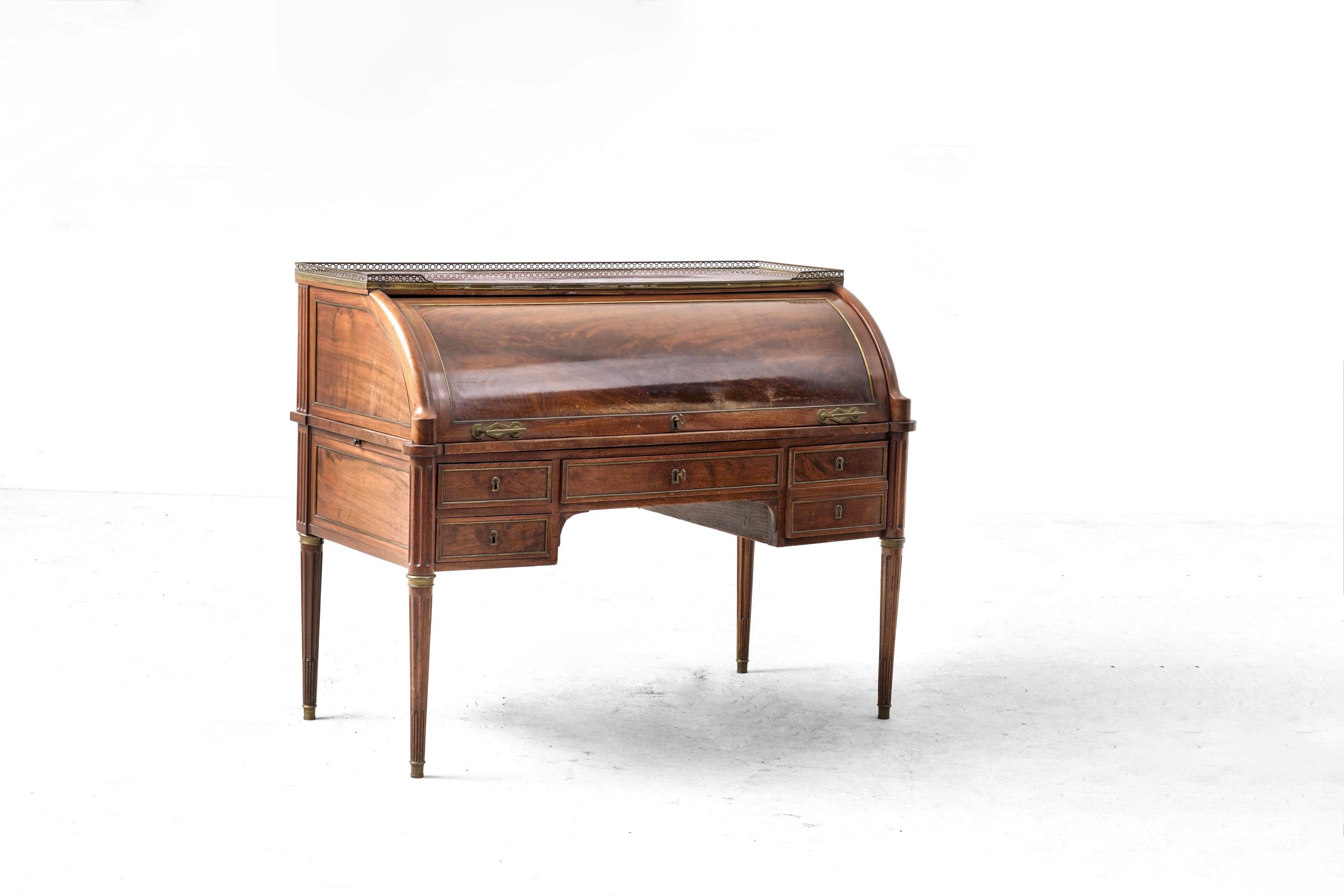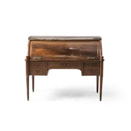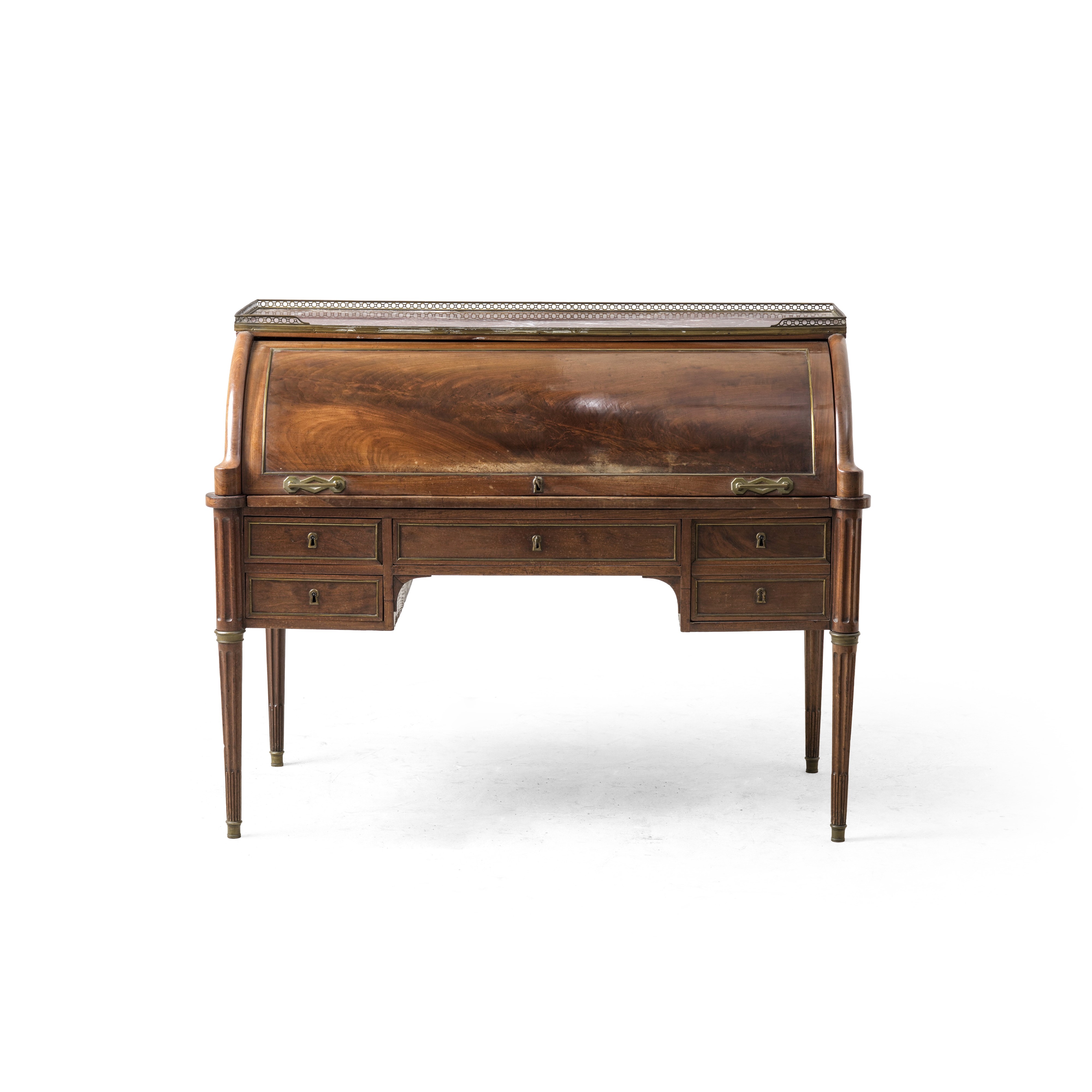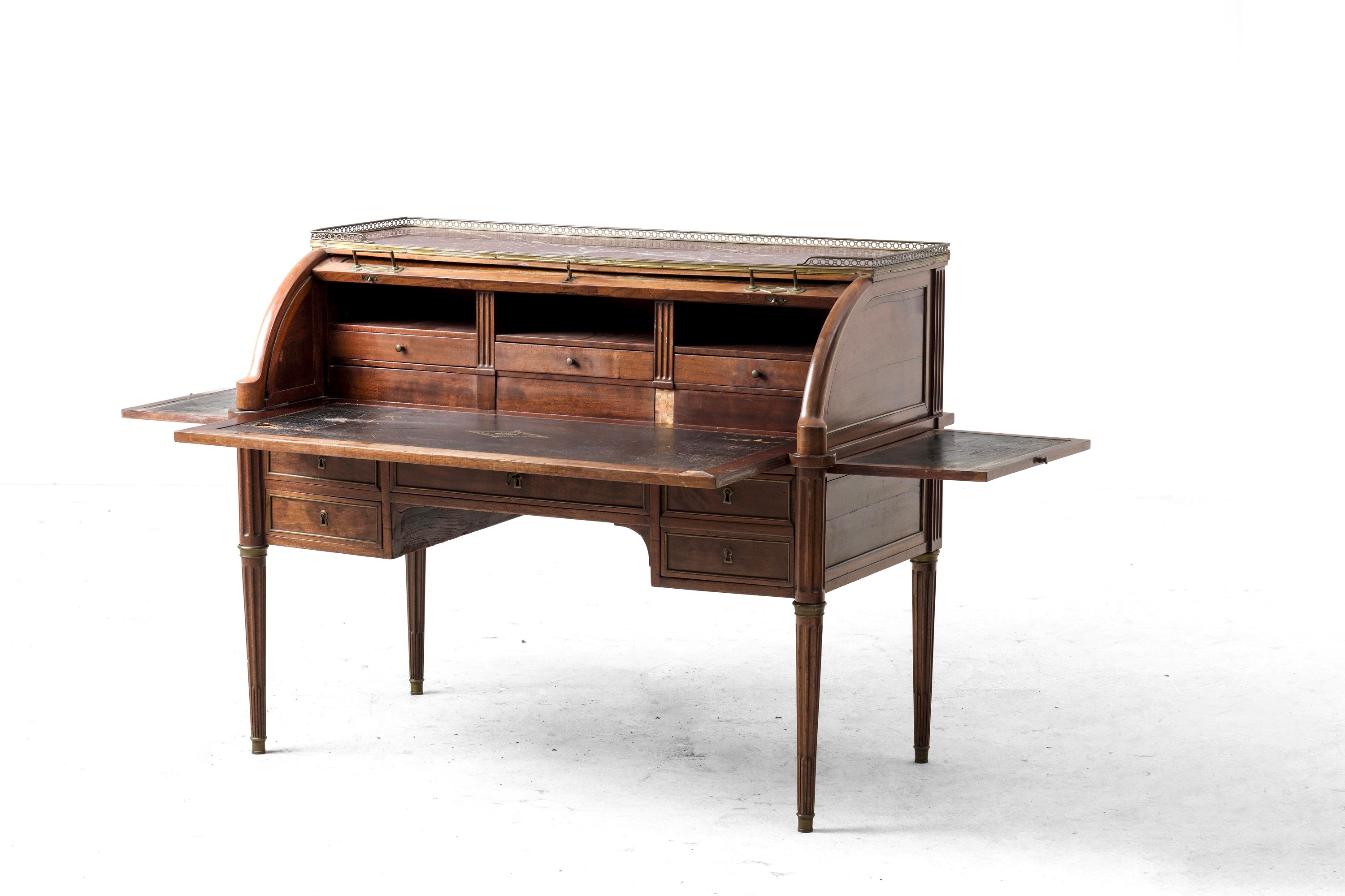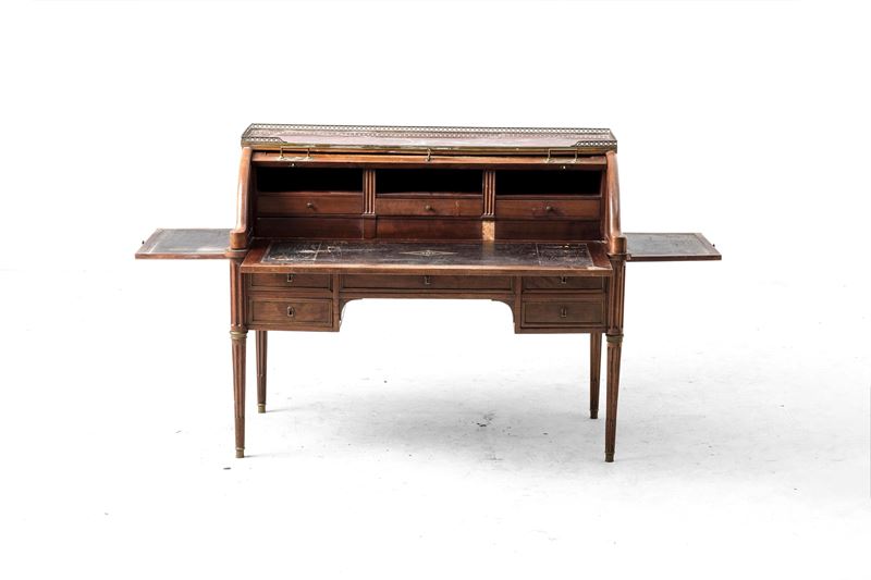 Fronte a cinque cassettini sormontati da scarabattolo apribile a rullo che cela cassettini, scomparti e piano foderato in cuoio, piano superiore in marmo con bordo in bronzo dorato e traforato, gambe troncoconiche scanalate