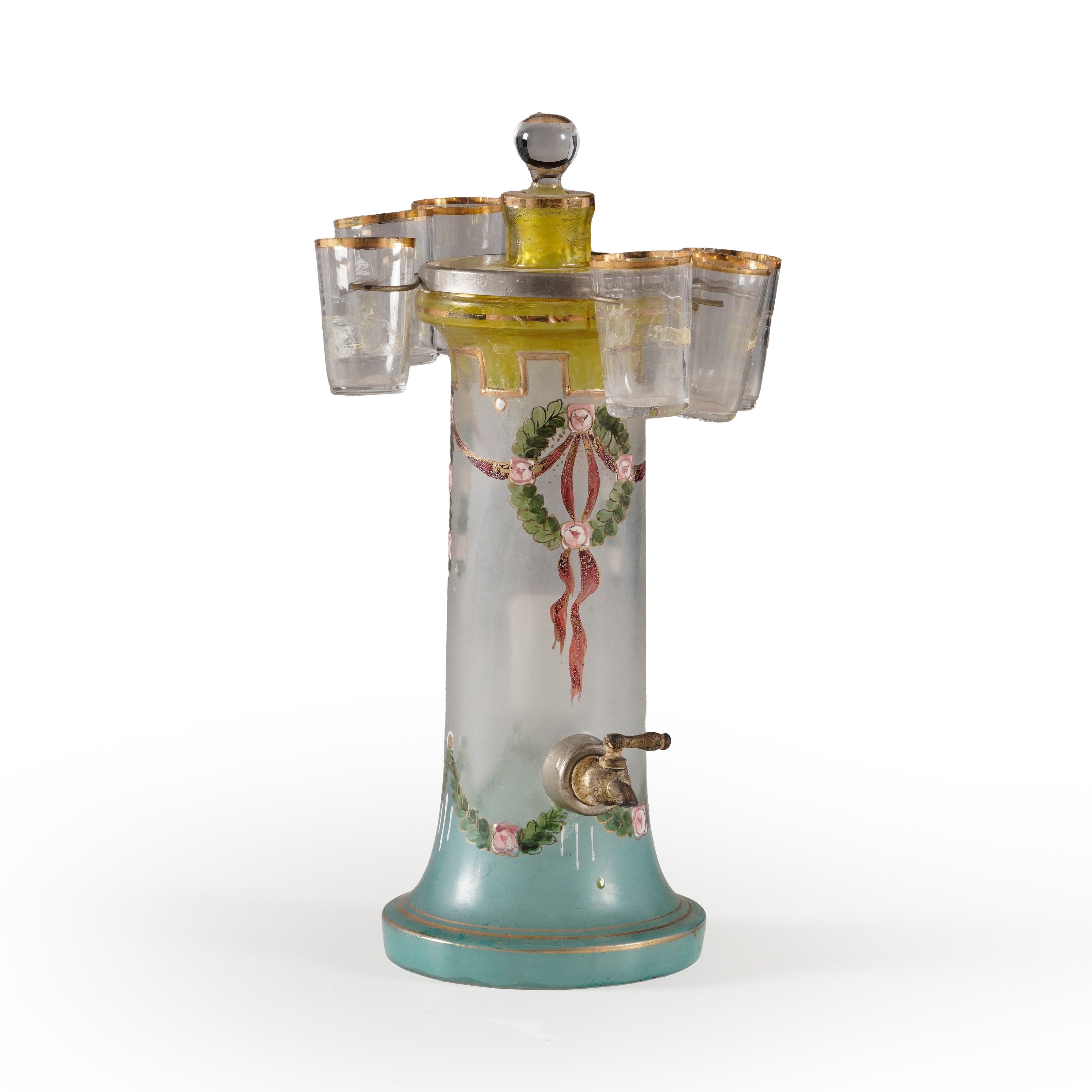Bottiglia con coperchio, rubinetto e porta bicchierini. Sette bicchierini con bordo dorato