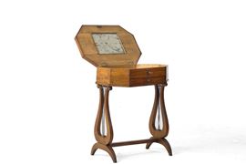 Gambe a lira, un cassettino nella fascia, piano apribile incernierato