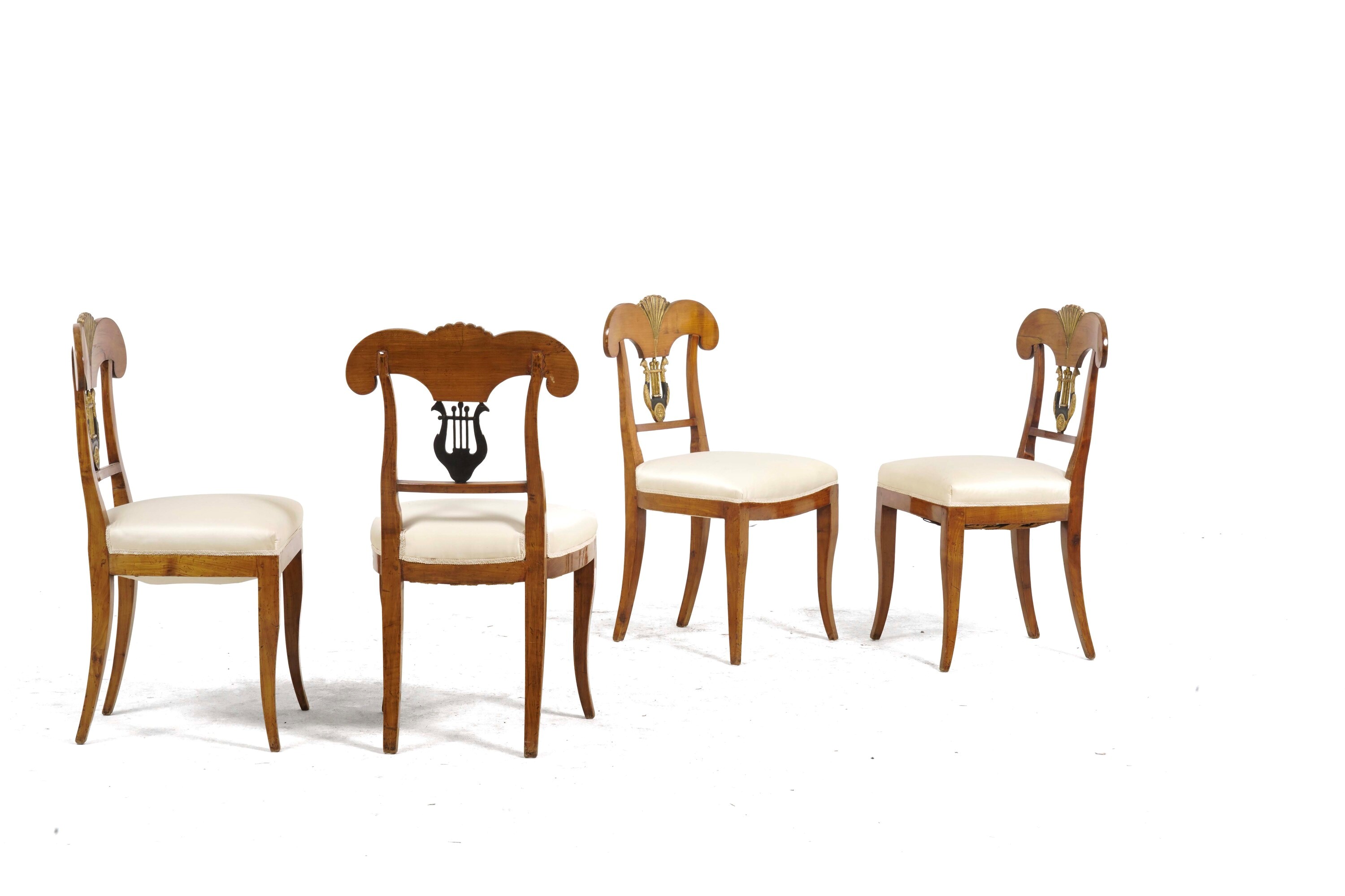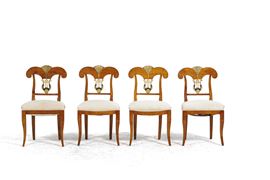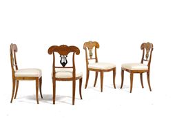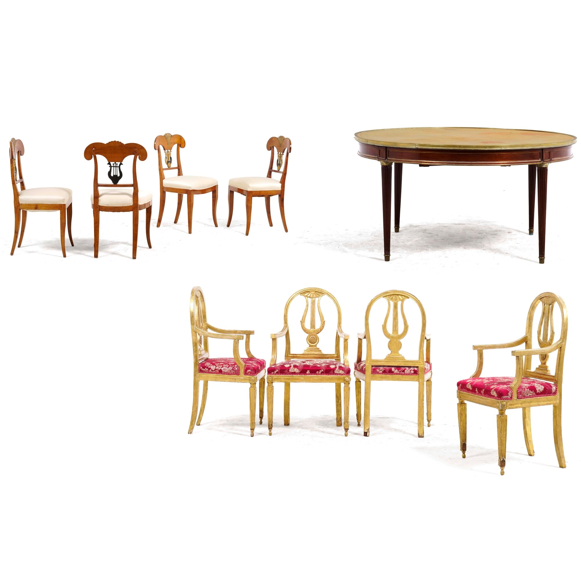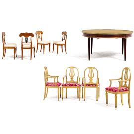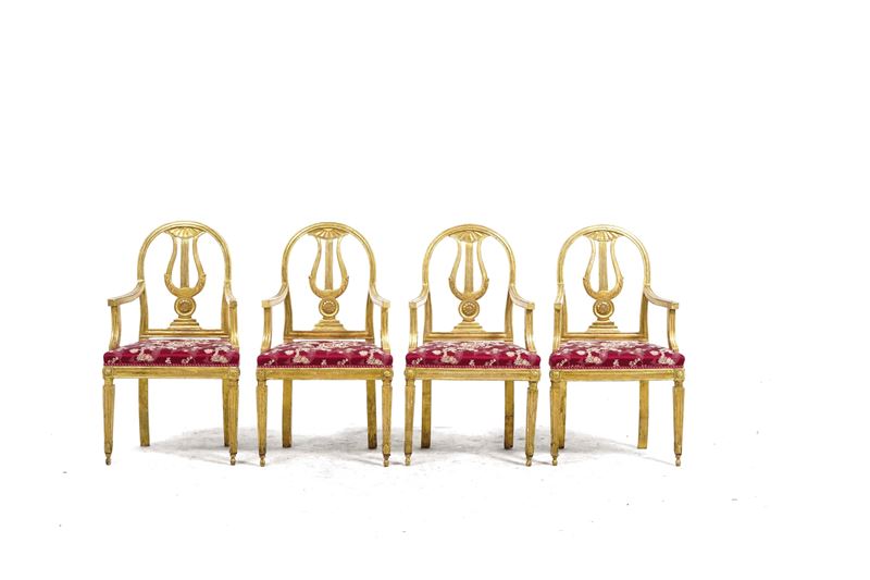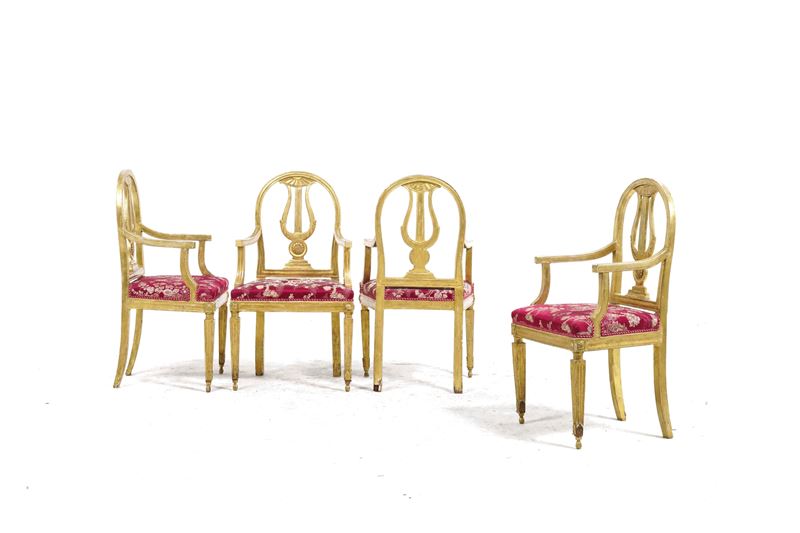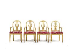 Tavolo con quattro sedie in legno intagliato, unito a quattro poltrone con schienale a lira