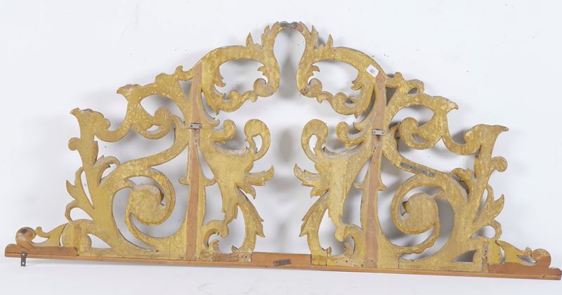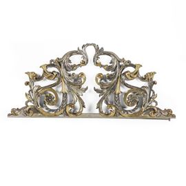 Testata da letto composta da due antichi fregi in legno intagliato, dorato e argentato