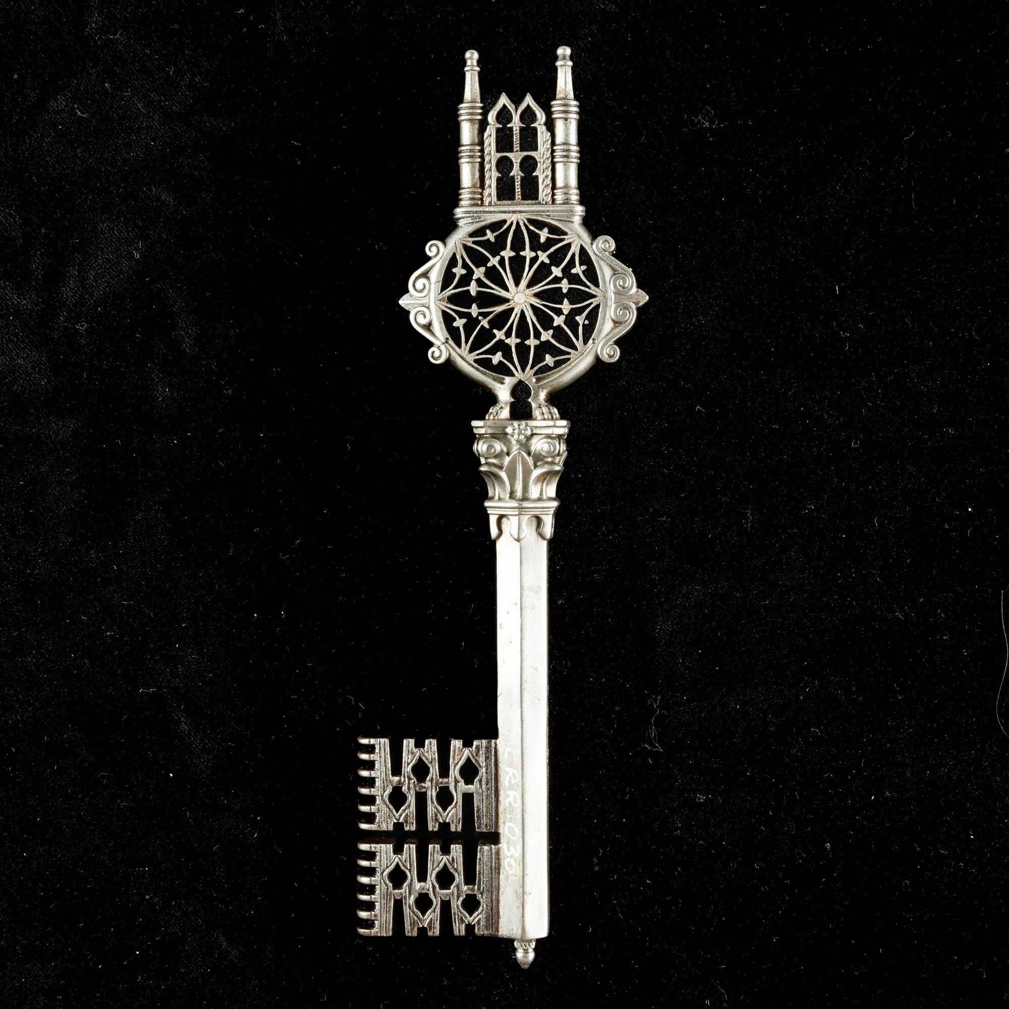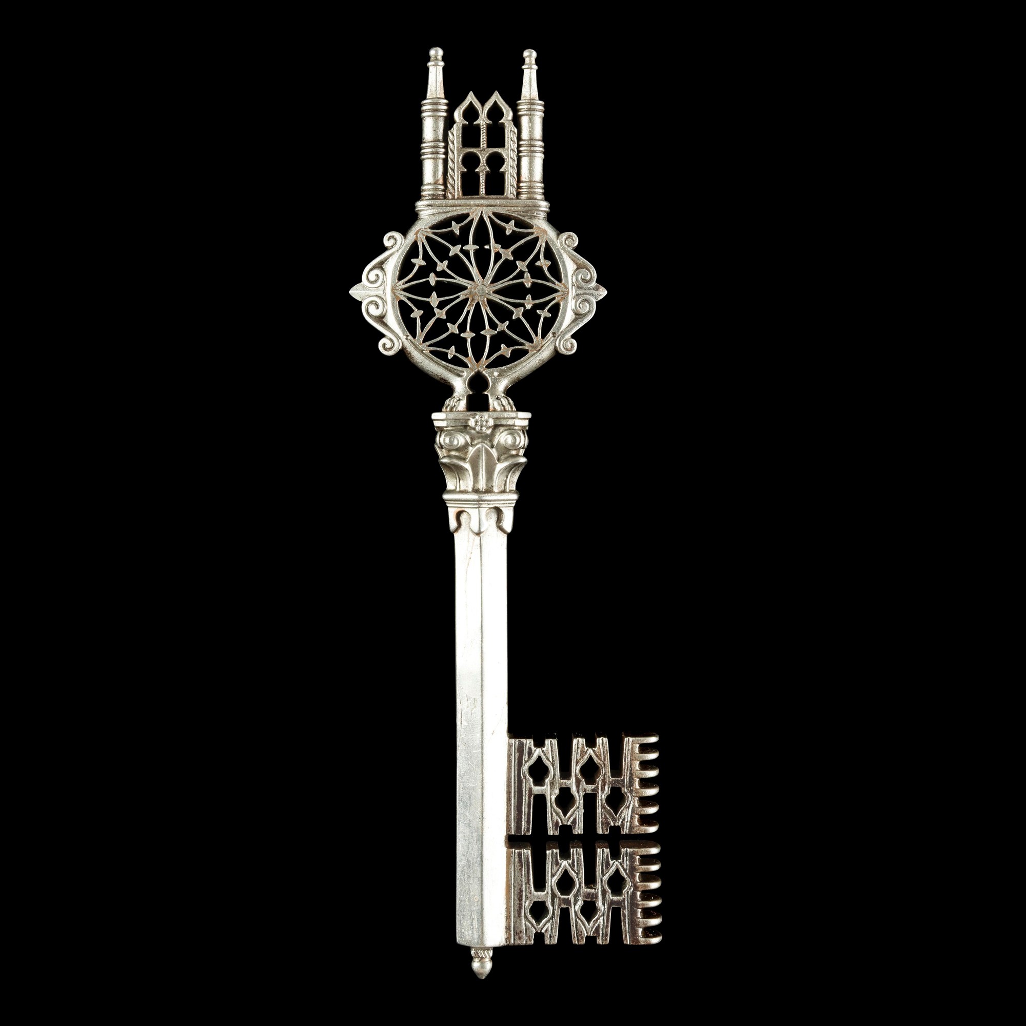 testa a rosone con lamelle radiali interne dritte e ricurve saldate fra di loro al centro e all’anello esterno arricchito da fregi, corona superiore a doppia bifora gotica, vera a capitello corinzio, fusto quadro vuoto con centratore terminale e le iniziali “F. D.” incise, mappa a due ranghi contrapposti con denti frontali e intagli a doppia greca