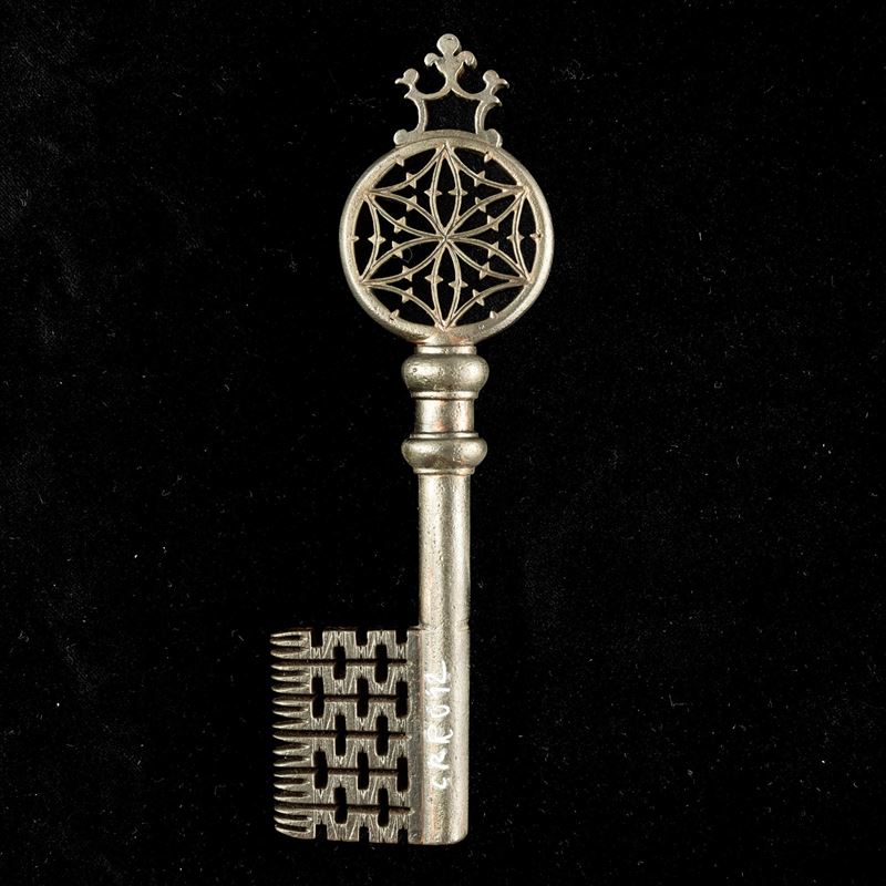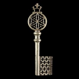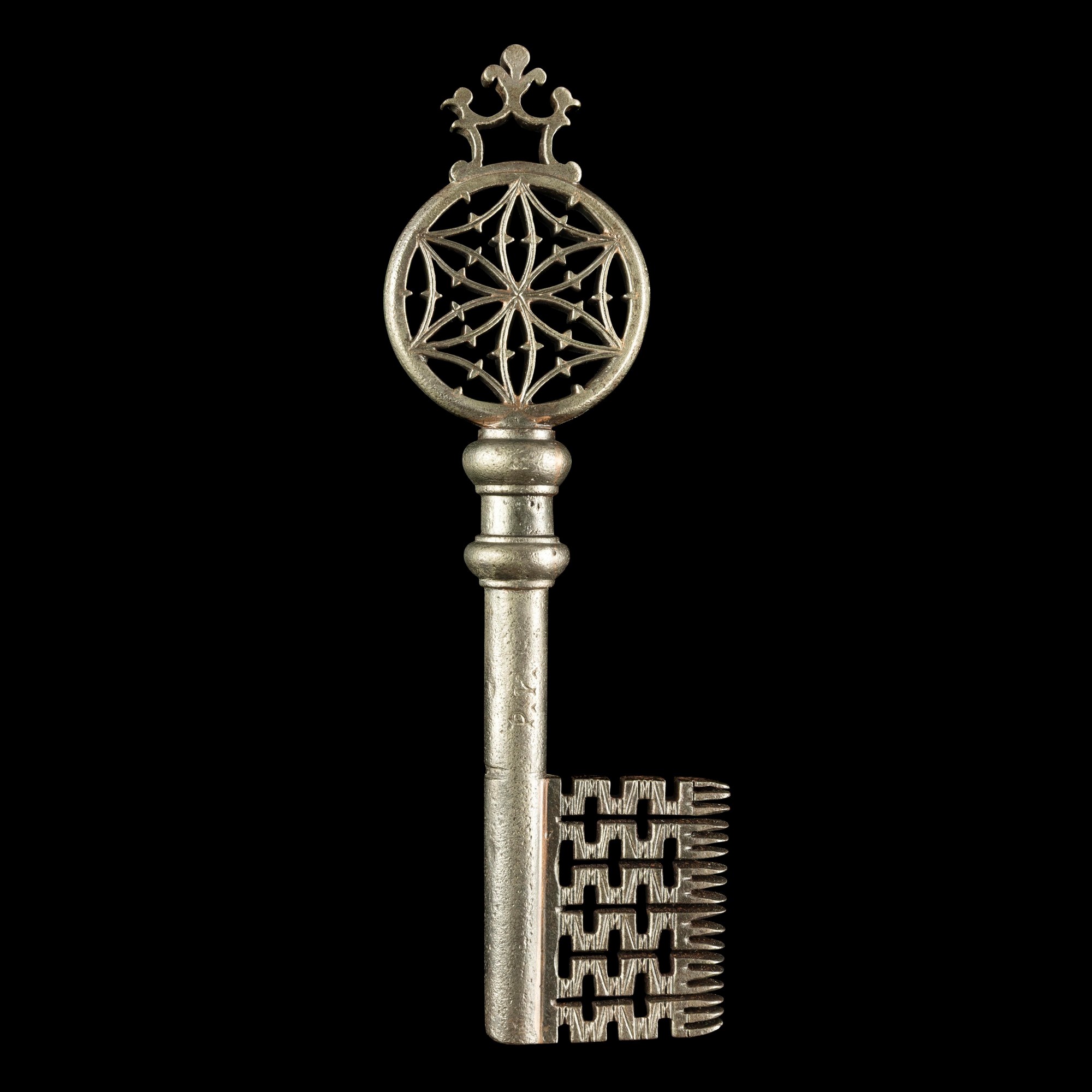 testa a rosone con esagono interno disegnato da lamelle dritte e ricurve saldate fra di loro e all’anello esterno, corona superiore a disegno con trifoglio terminale, vera con due anelli toroidali, fusto vuoto con le iniziali “P.V.” incise, mappa a cinque ranghi contrapposti con denti frontali e intagli a greca