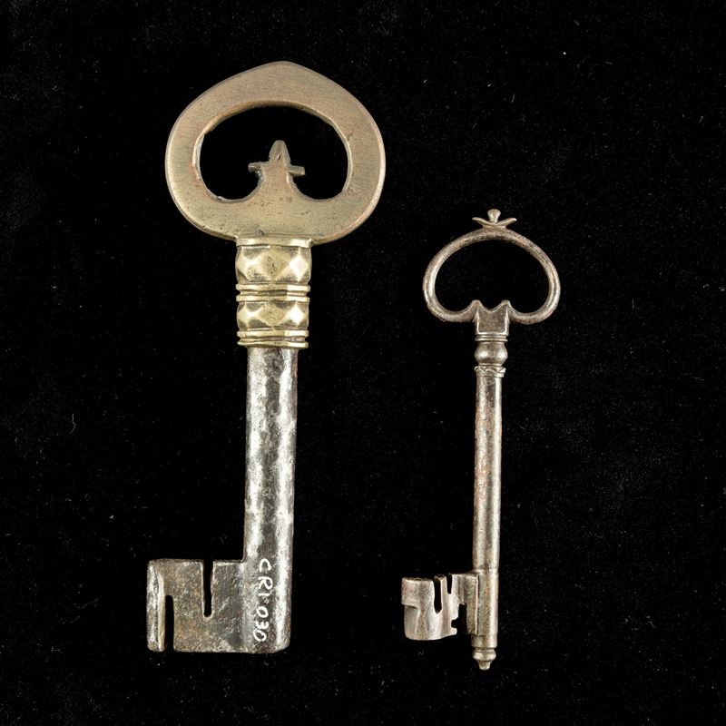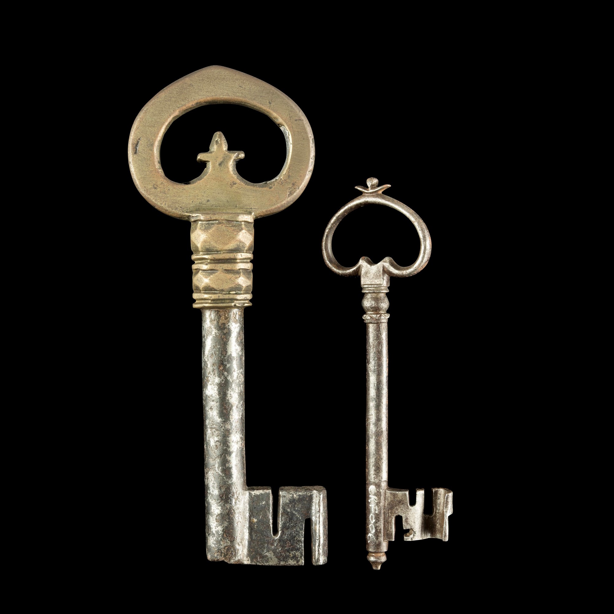 Due chiavi rinascimentali in ottone e ferro forgiato. Piemonte e Francia, XVI secolo