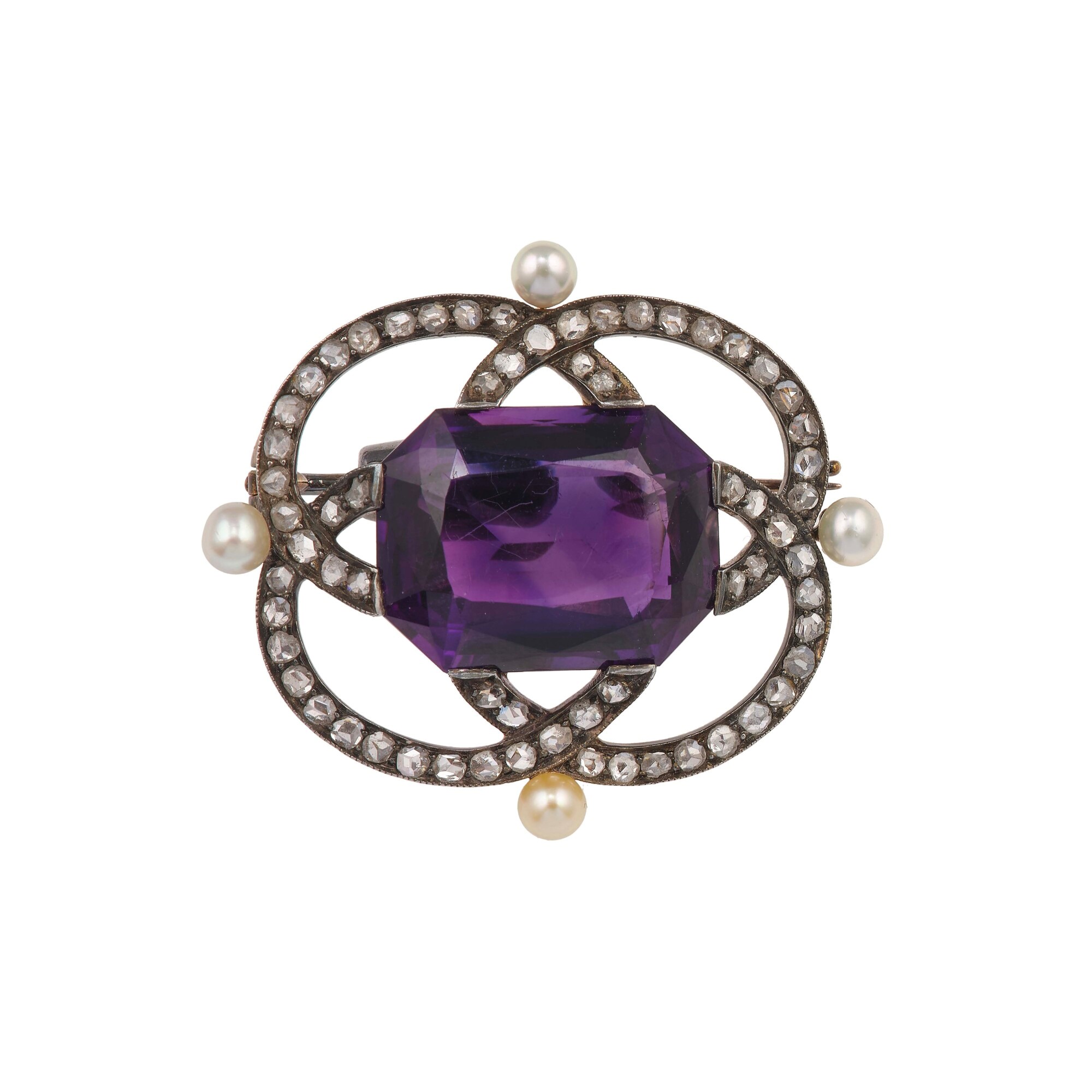 Amethyst, rose-cut diamond, pearl, gold and silver brooch