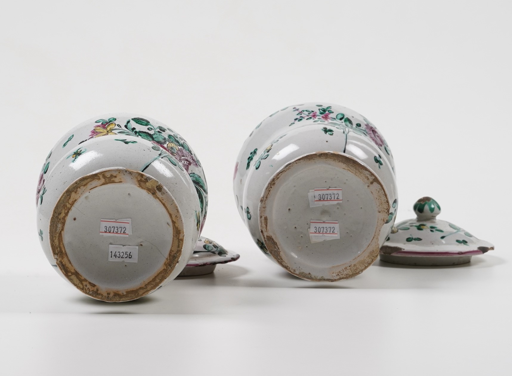 Maiolica. Marca: assente. Altezza cm 23 circa. Conservazione: qualche sbeccatura; una leggera felatura; parte del bordo di un coperchio incollata.