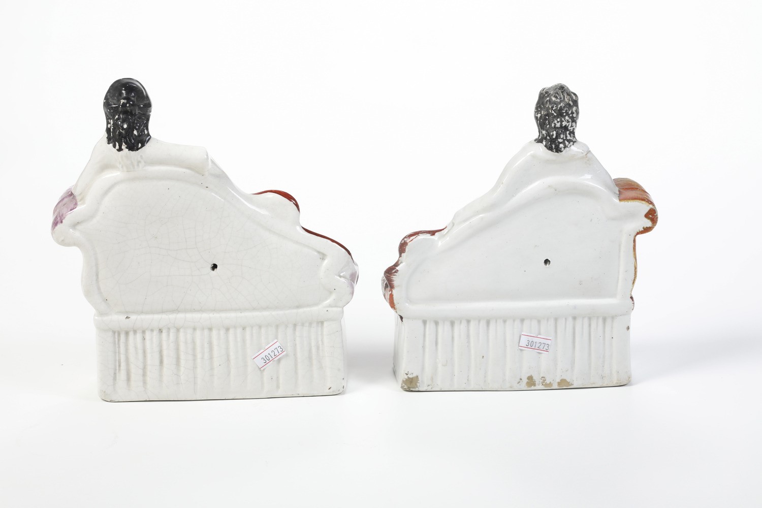 Coppia di grandi figure di musicisti su chaise longue. Inghilterra, Staffordshire, periodo vittoriano, XIX secolo.