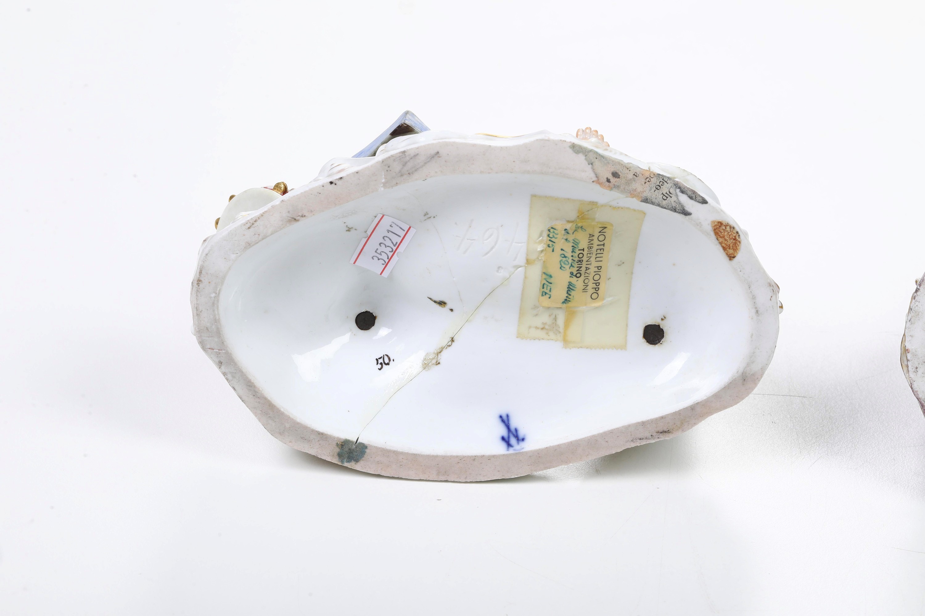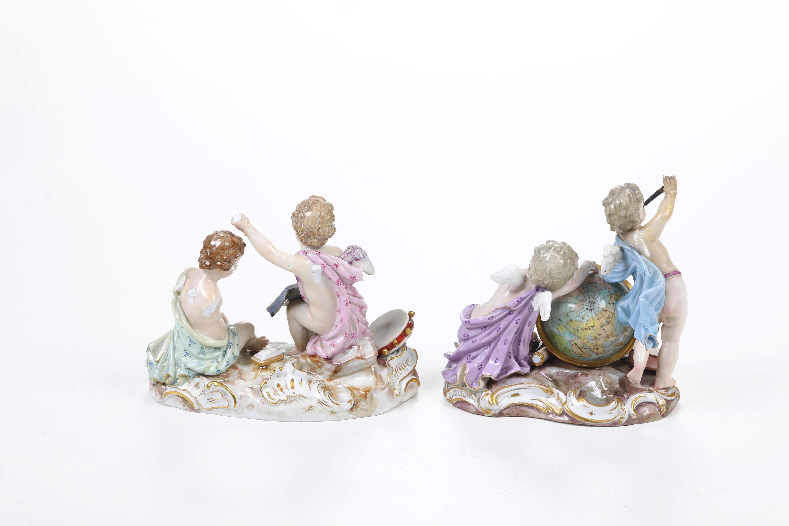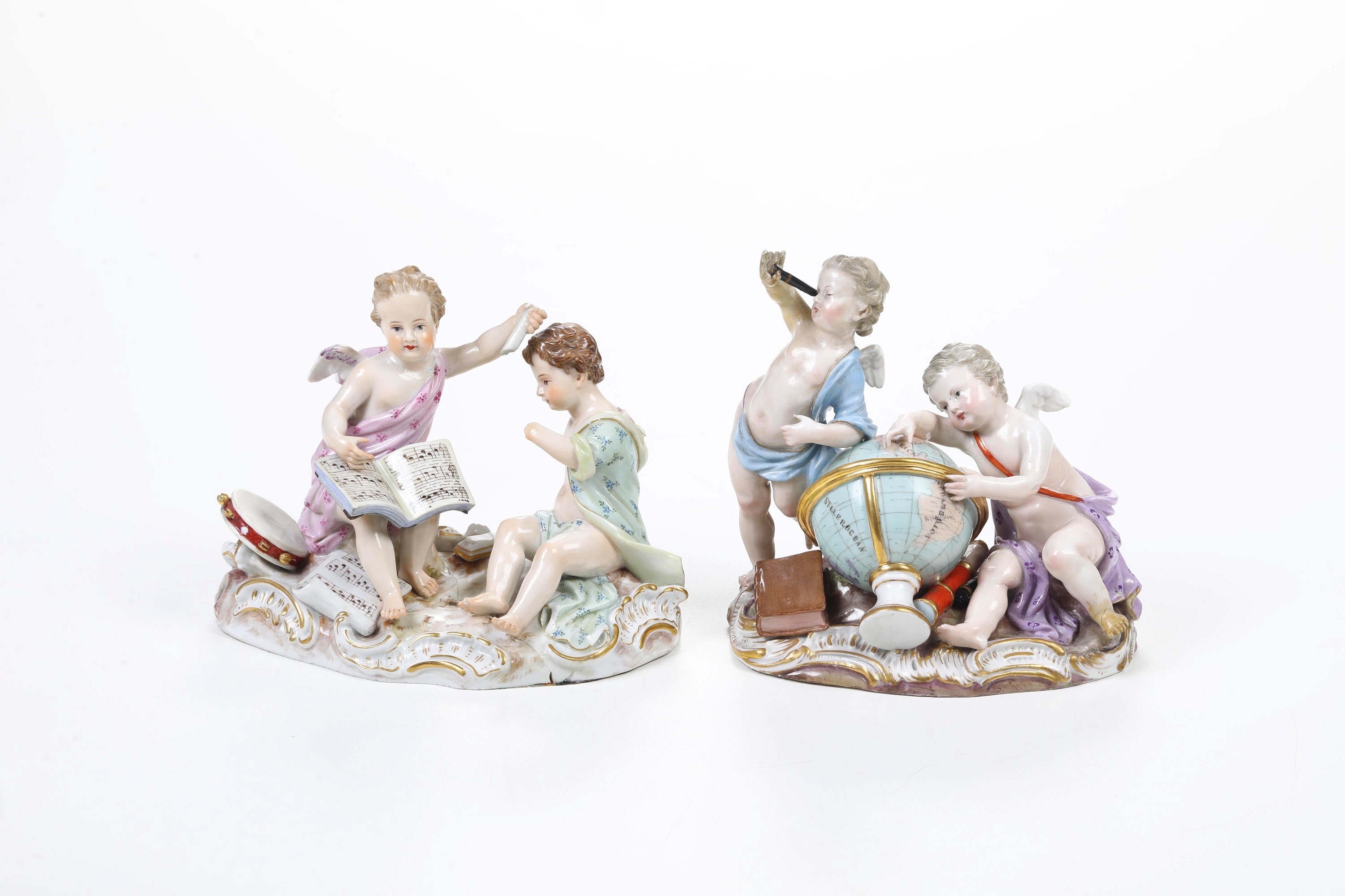 Porcellana. Marca: spade in blu. Altezza: cm 14,5; cm 13. Conservazione: astronomia con un piede, monocolo e braccio destro restaurati; musica con mancanti tre ali, una mano, un braccio e leggio.