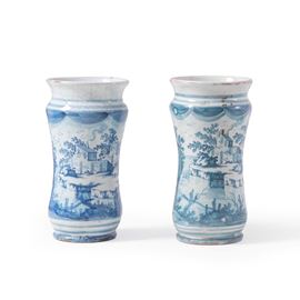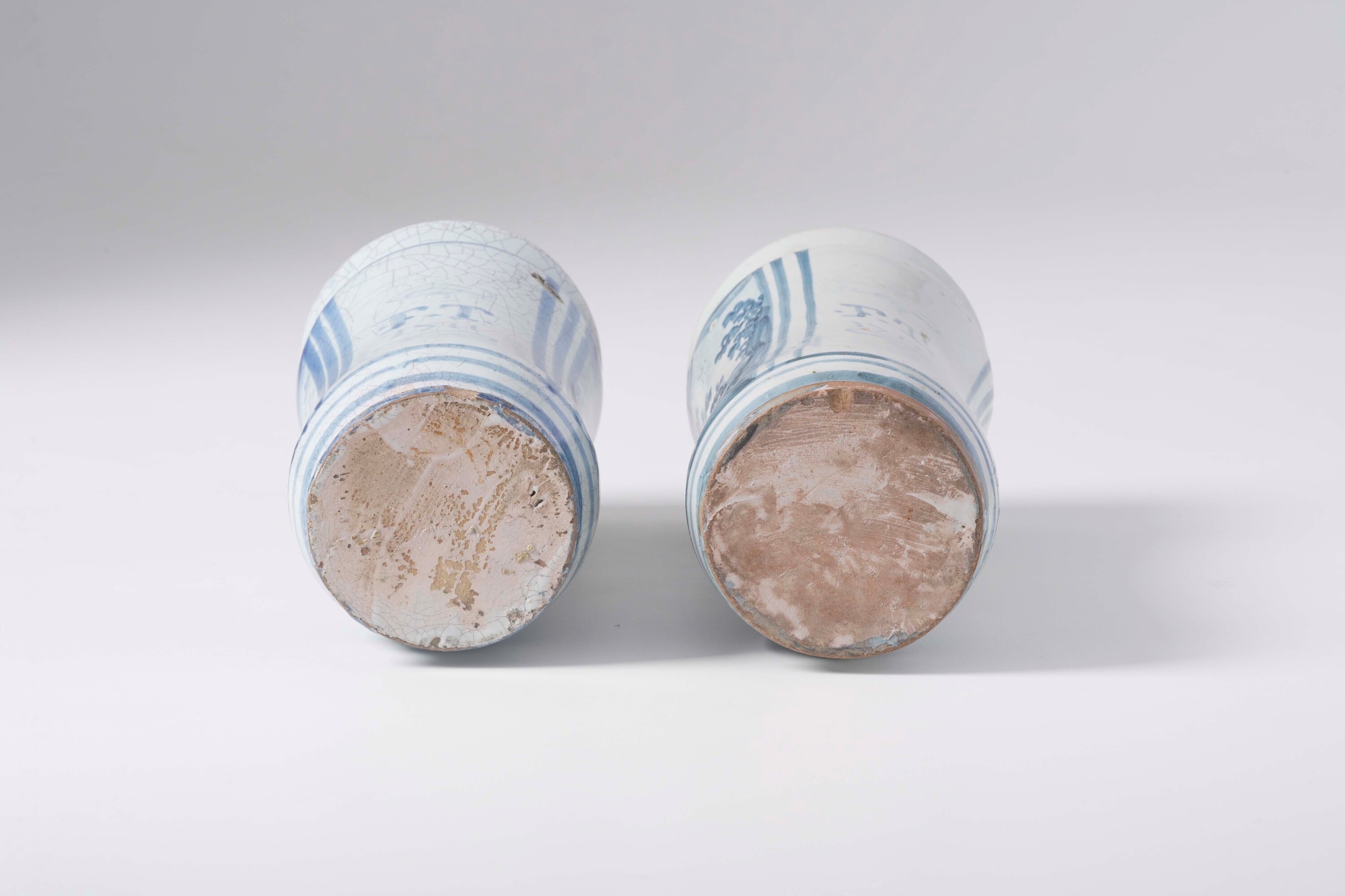 Maiolica. Marca: assente. Altezza cm 19. Conservazione: un albarello con piccola sbeccatura incollata al bordo superiore