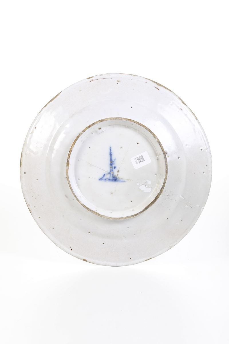 Maiolica. Marca: lanterna. Diametro cm 40,5. Conservazione: lunghe felature coperte con vecchio restauro; sbeccature al bordo in parte restaurate.