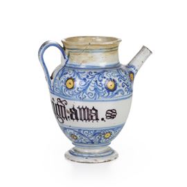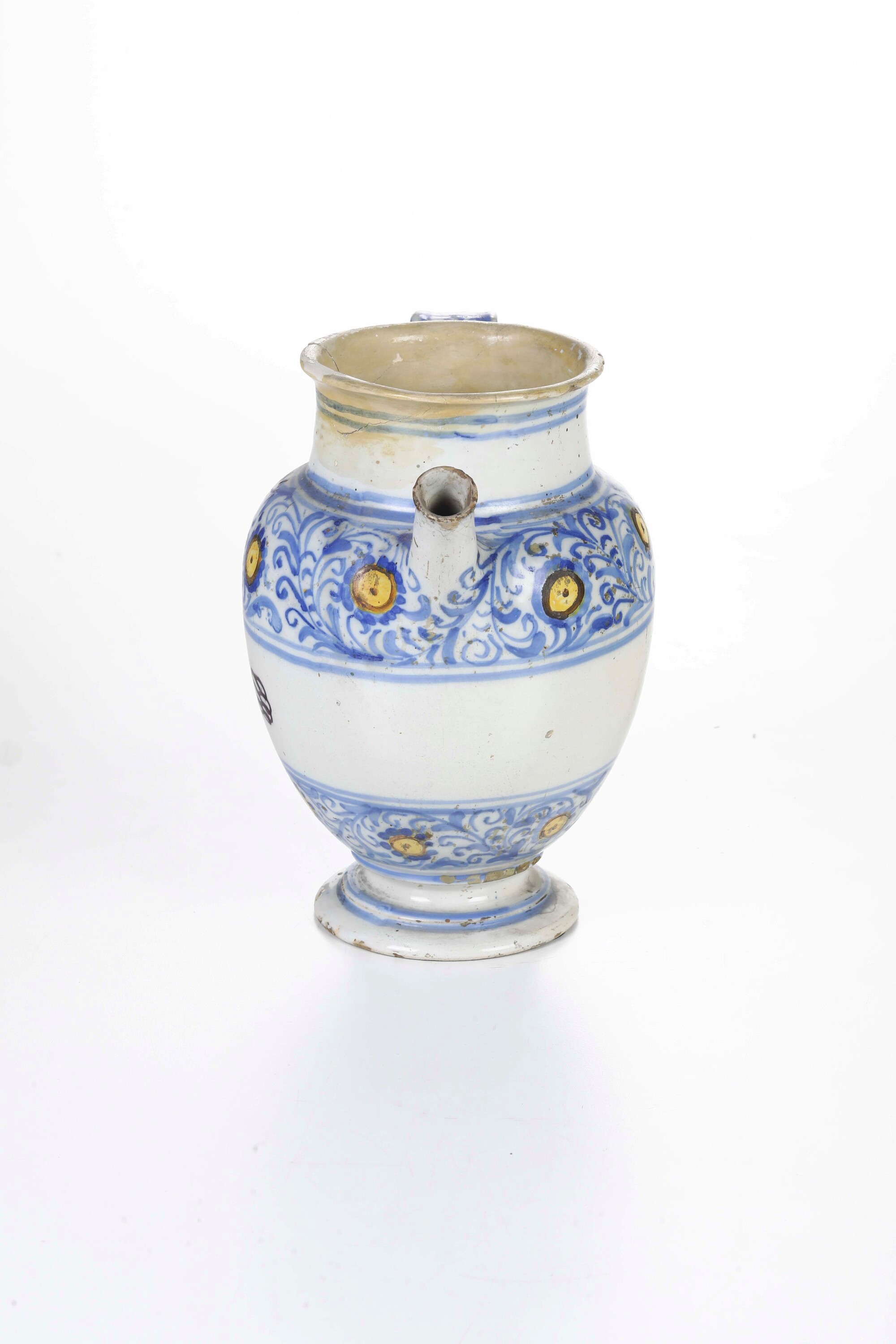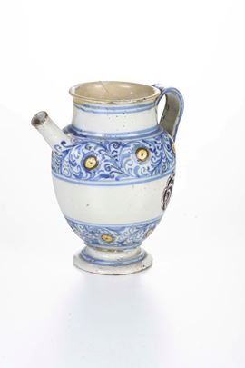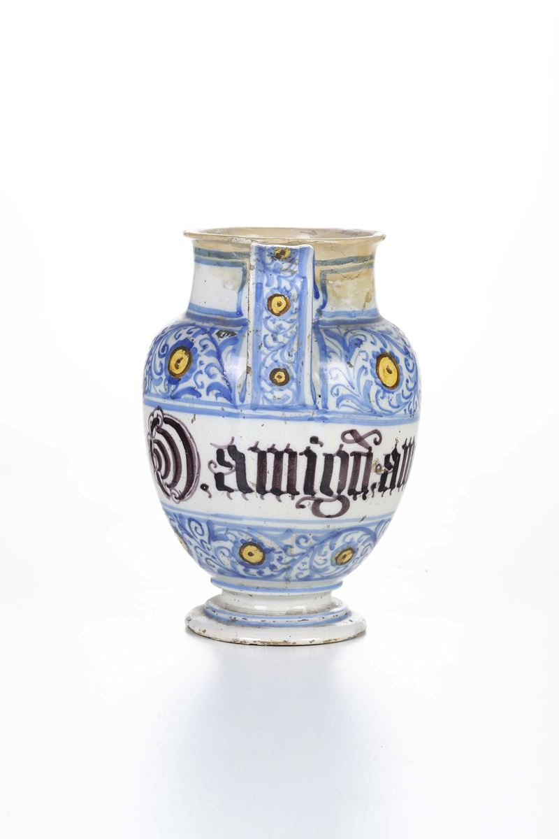 Maiolica. Altezza: cm 21. Conservazione: mancanze al bordo superiore integrate con vecchio restauro; insignificanti cadute di smalto ai bordi.
