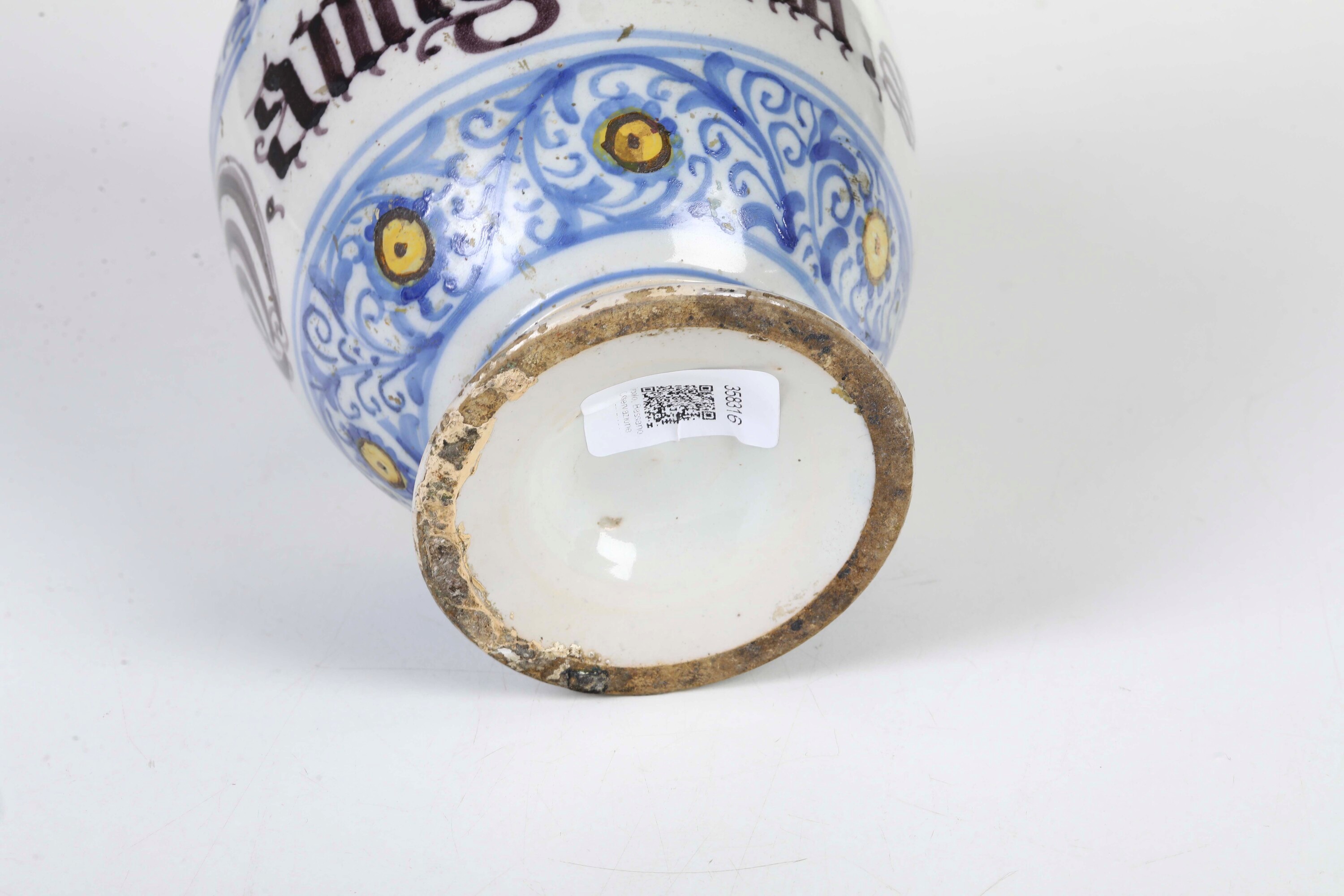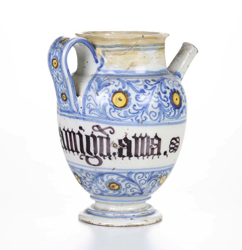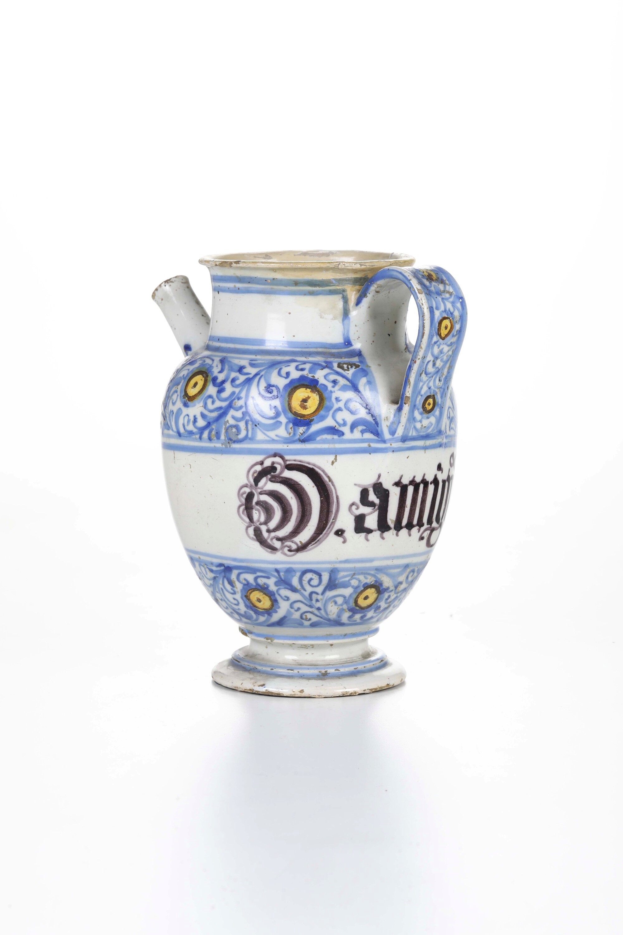 Dal corpo ovoidale su base sagomata con beccuccio cilindrico e ansa a nastro, è decorato in blu di cobalto, giallo e ocra su smalto bianco. Una fascia centrale reca l’iscrizione apotecaria a caratteri gotici in manganese incorniciata da due fasce con girali fogliate e un fiore molto stilizzato al centro