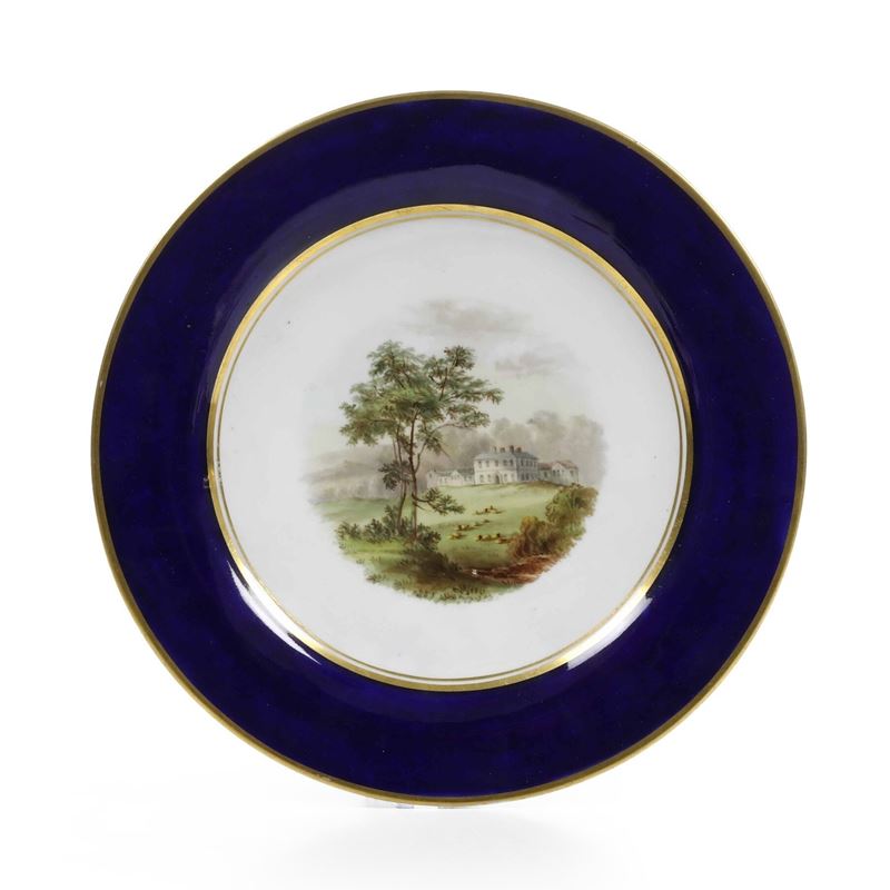 Piatto dalla tesa liscia decorato in policromia nel cavetto con un paesaggio con edifici e incorniciato dalla tesa a fondo blu filettata in oro.