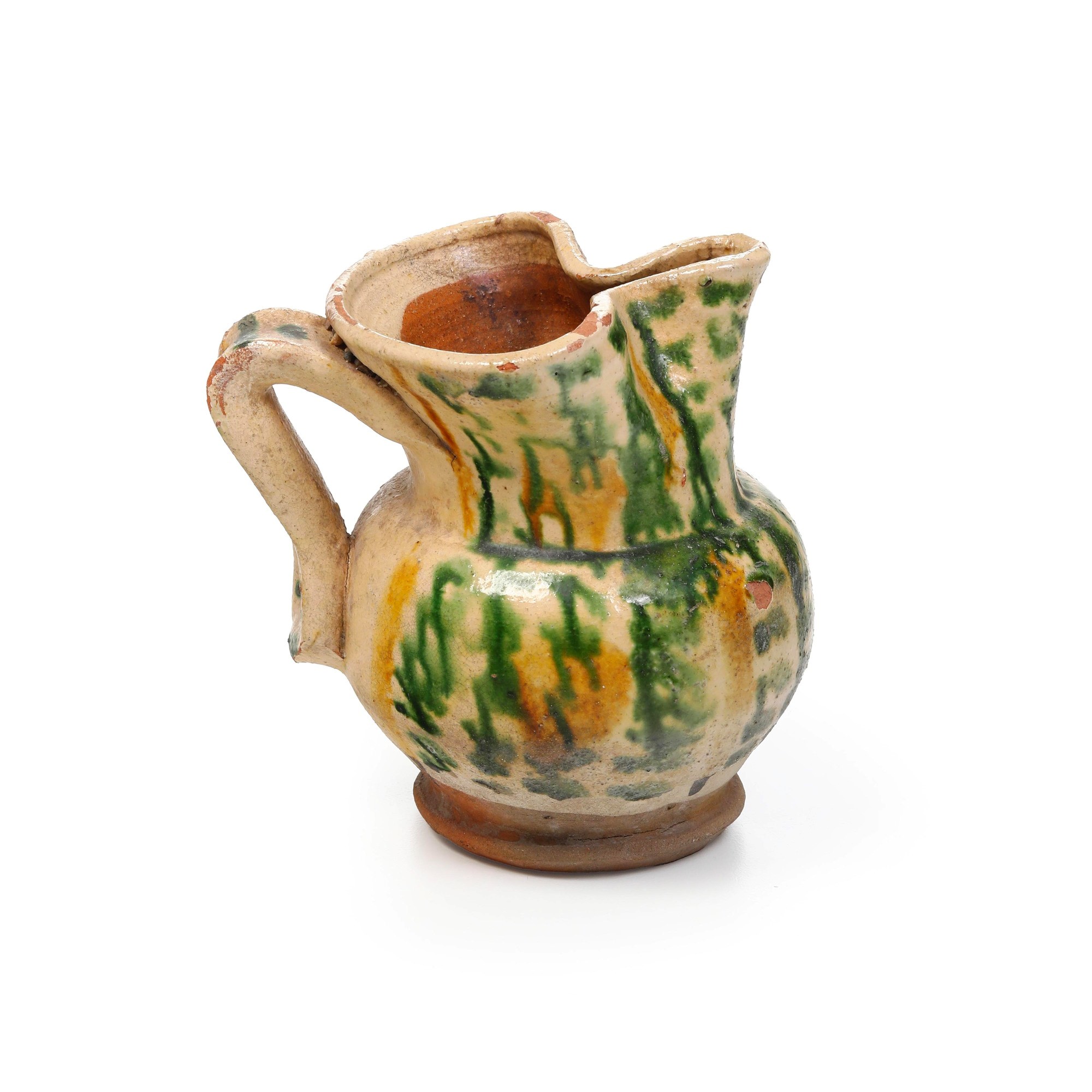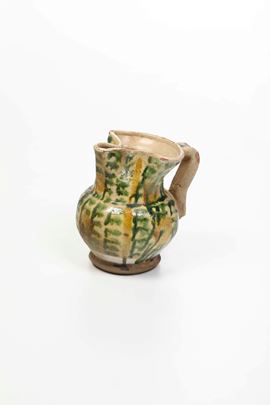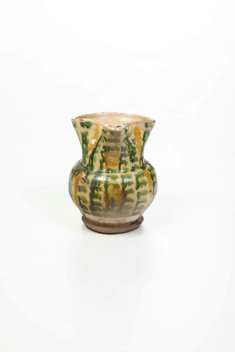 Dal piede a disco, dal corpo sferoidale, con bocca trilobata e spessa ansa, è rivestita di ingobbio e presenta decorazioni a pennellate in verde ramina e giallo ferraccia