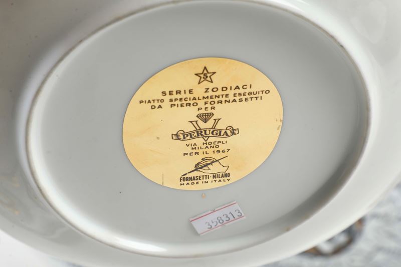 Porcellana. Marca: simbolo grafico di Fornasetti e della gioelleria Perugia, “serie zodiaci piatto specialmente eseguito da Piero Fornasetti per Perugia via Hoepli Milano”. Diametro cm 31,3. Conservazione: ottima.