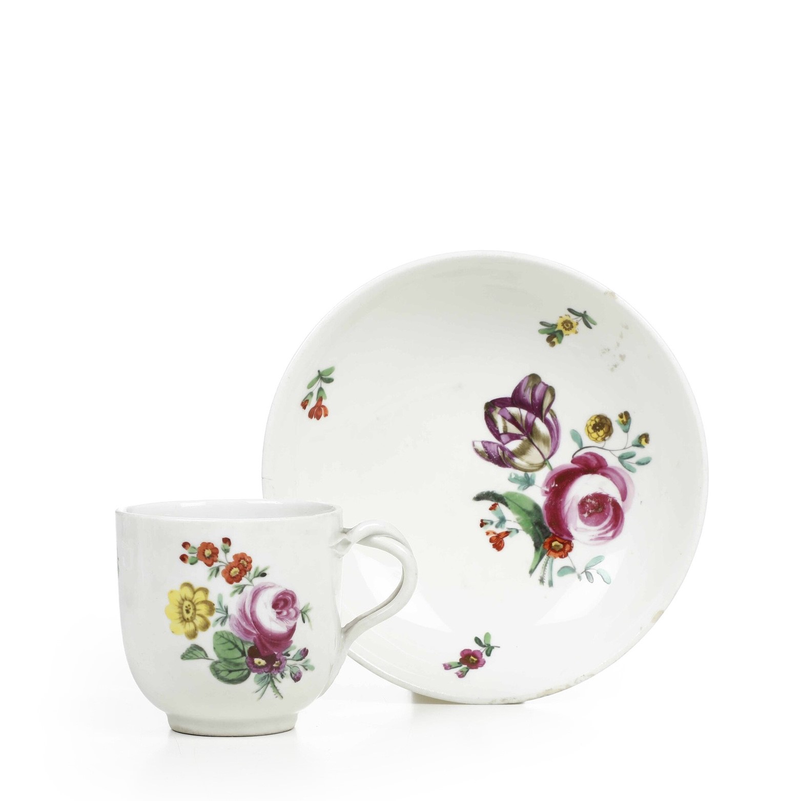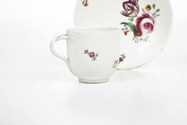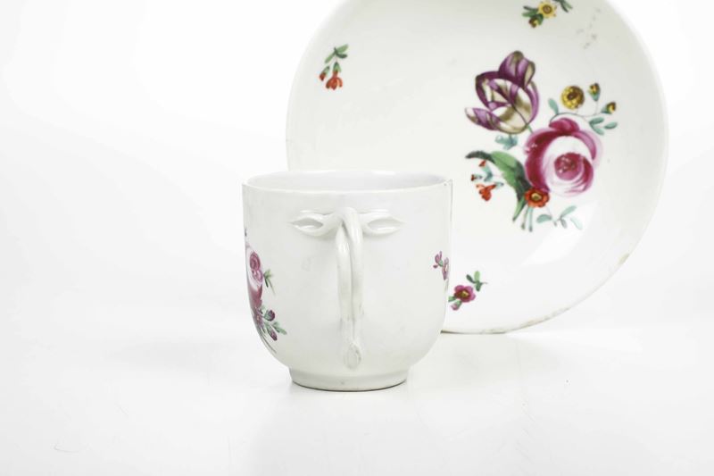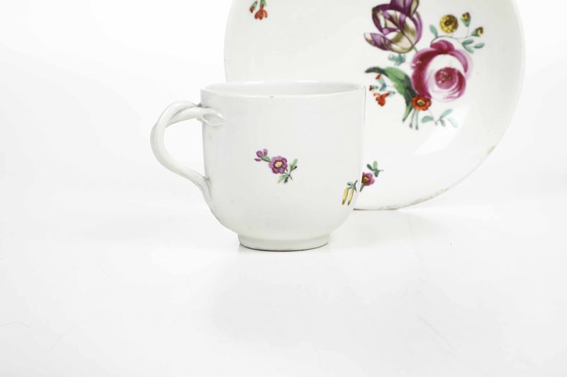Porcellana. Marca: scudo in blu. Dimensioni: altezza tazza cm 6,4; diametro piattino cm 13,8. Conservazione: piccola sbeccatura con vecchio restauro al bordo del piattino.