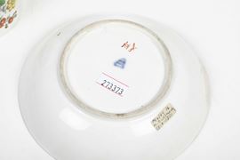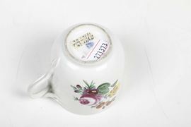 Porcellana. Marca: scudo in blu. Dimensioni: altezza tazza cm 6,4; diametro piattino cm 13,8. Conservazione: piccola sbeccatura con vecchio restauro al bordo del piattino.