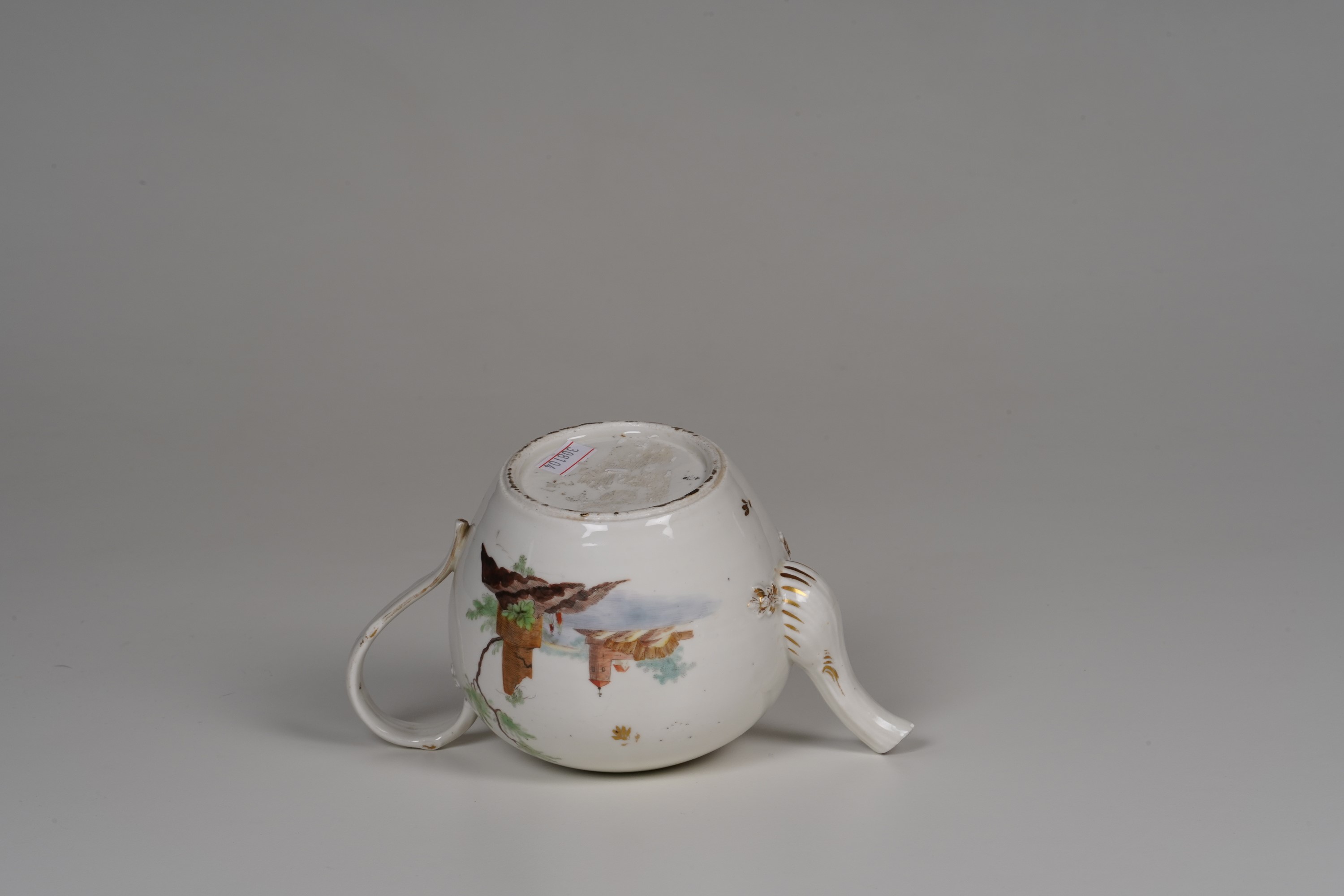 Teiera globulare con manico e beccuccio modellati a ramo vegetale con foglioline e fiori all’innesto sul corpo. Coperchio con presa a bocciolo fogliato. La decorazione policroma vede due paesaggi, animati da piccoli viandanti, con edifici e rovine architettoniche. Filettaura e lumeggiature in oro.