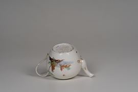 Porcellana. Marca: assente. Altezza cm 11. Conservazione: manico e punta del beccuccio restaurati; coperchio di rimpiazzo.
