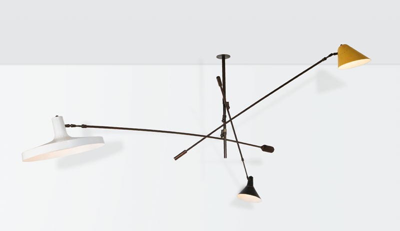 Tra la ricca proposta di illuminazione si è distinto un lampadario Stilnovo con bracci estensibili ed orientabili in ottone e con riflettori in metallo laccato (Italia, 1950 ca.), venduto a 14.410 €.